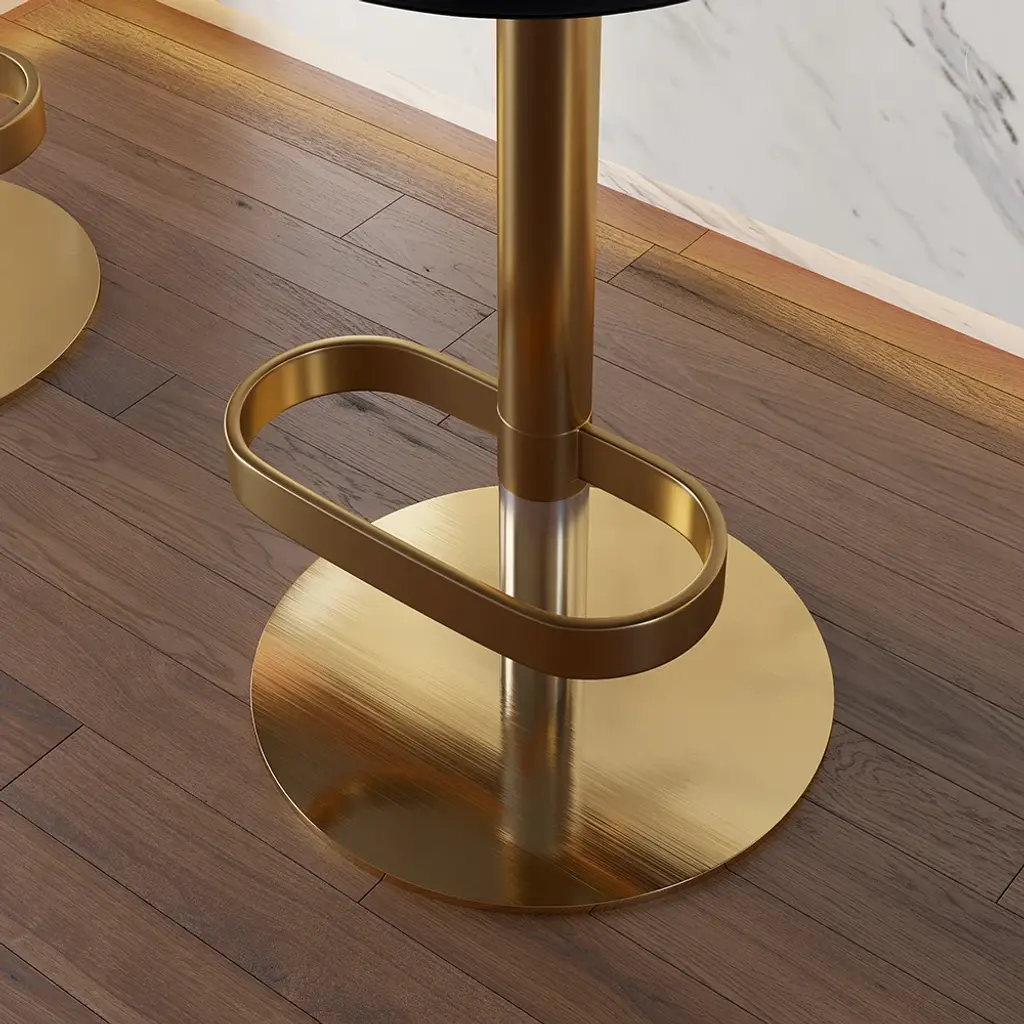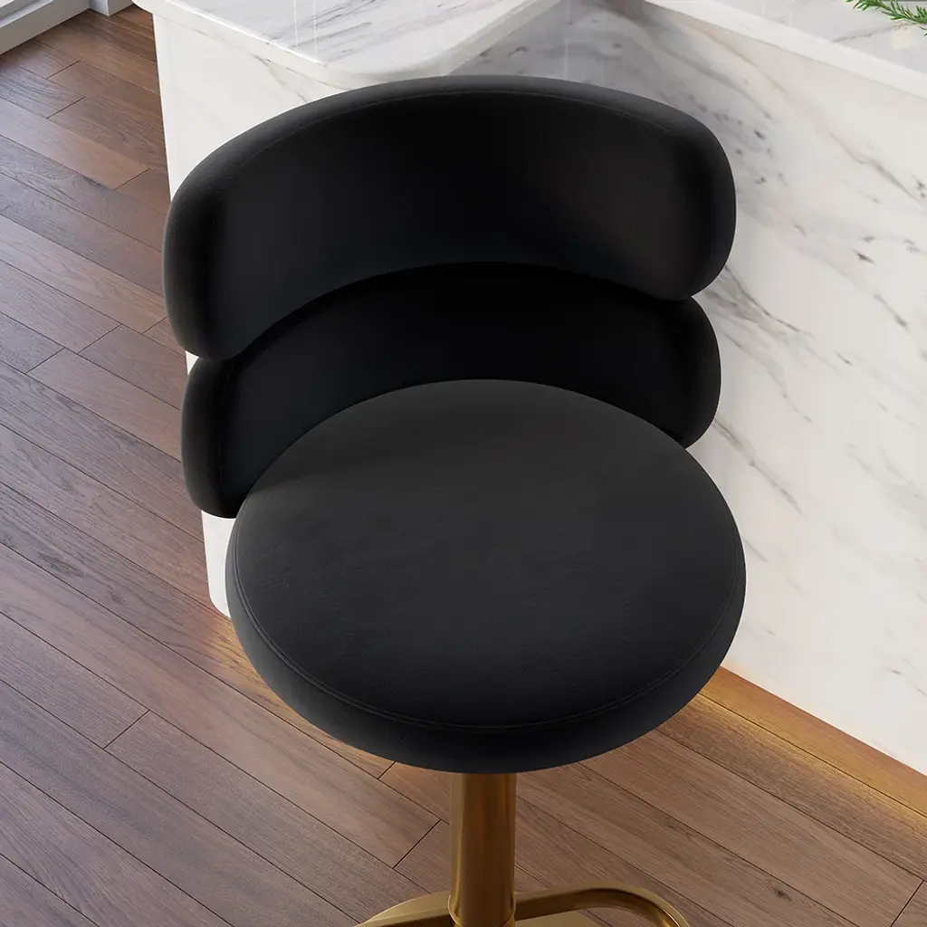 Give your dining or kitchen area a face-lift by placing this stylish modern swivel bar stool. It comes upholstered in the richness of black velvet, featuring a comfortable round seat and a curved backrest for support. The adjustable height function makes it appropriate for various counters, while the footrest adds an extra angle of comfort. Crafted with a sleek gold stainless steel frame, this stool infuses elegance and durability into your space. The perfect setting to enjoy your meals or socialize in style, this swivel bar stool will elevate any room.