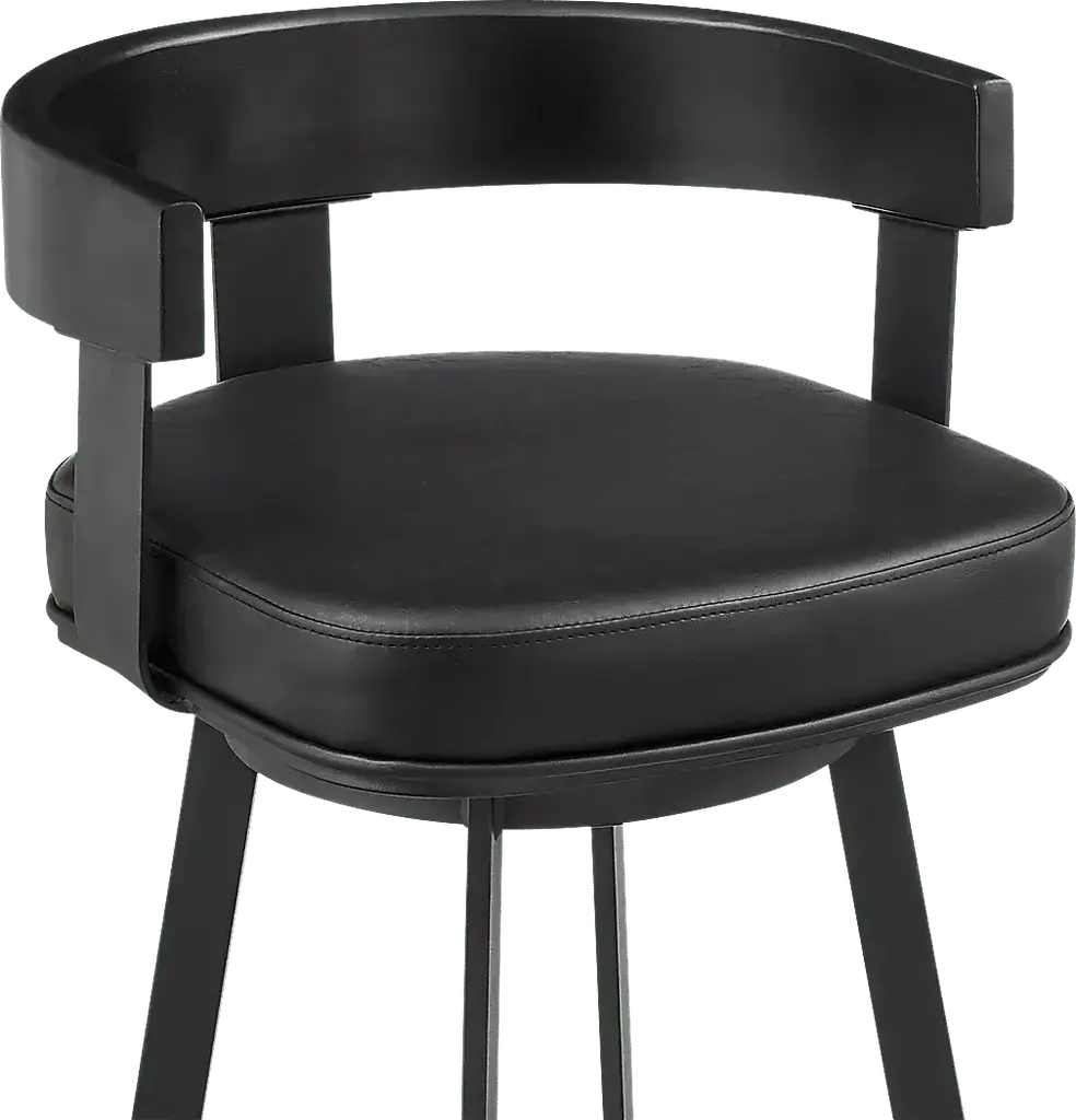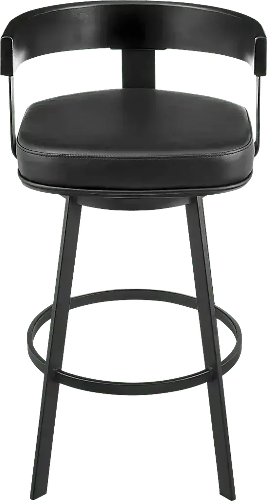 Upgrade your space with the sleek style and charm of the Shadefly I black barstool. Inspired by mid-century modern design principles, this stool offers an elevated appearance and exceptional comfort. A refined barrel back envelopes your body, and the thick, high-density cushion offers extraordinary support. The generously padded seat is wrapped with luxurious faux leather to offer a premium seating experience. It lends a sophisticated touch to your kitchen island, pub table, home bar, or adjustable desk. The stool includes a built-in circular footrest, and its smooth, 360-degree swivel function enables you to change direction with ease and engage with everyone around you. Customer assembly is required.