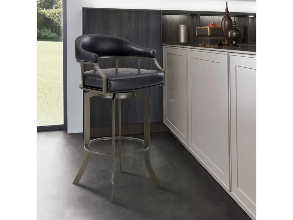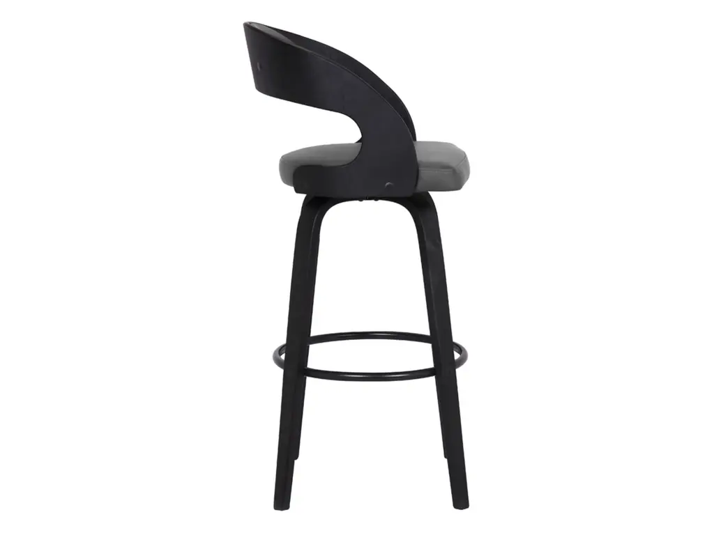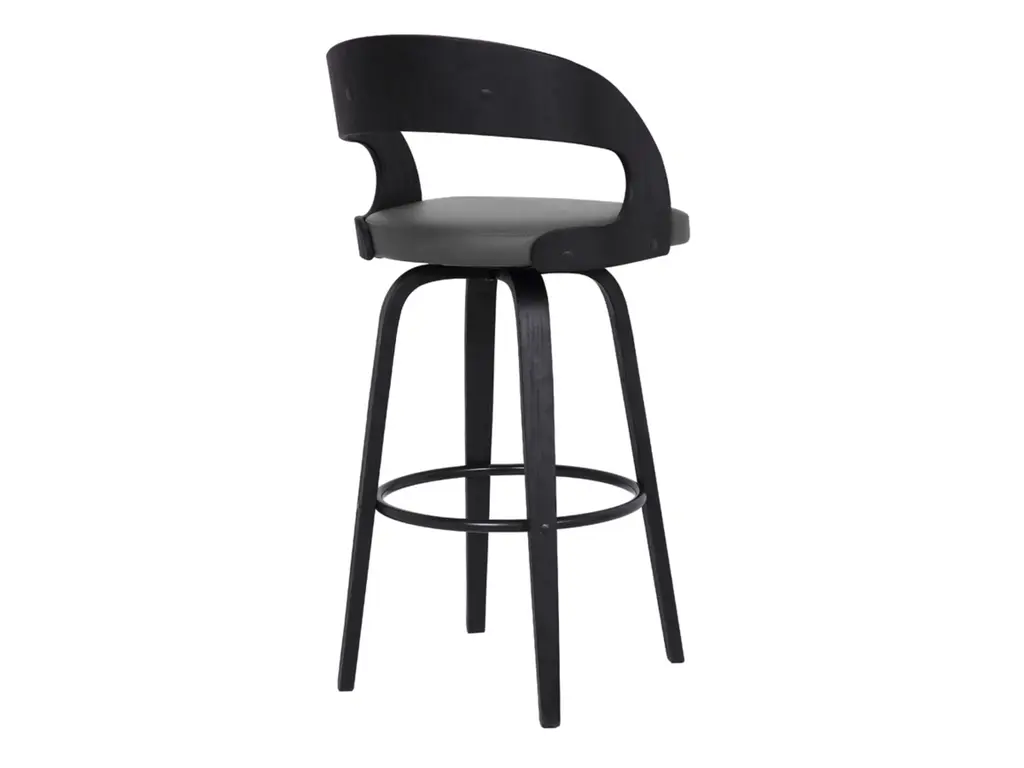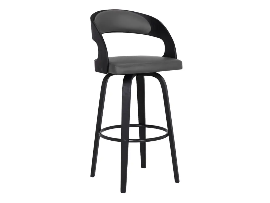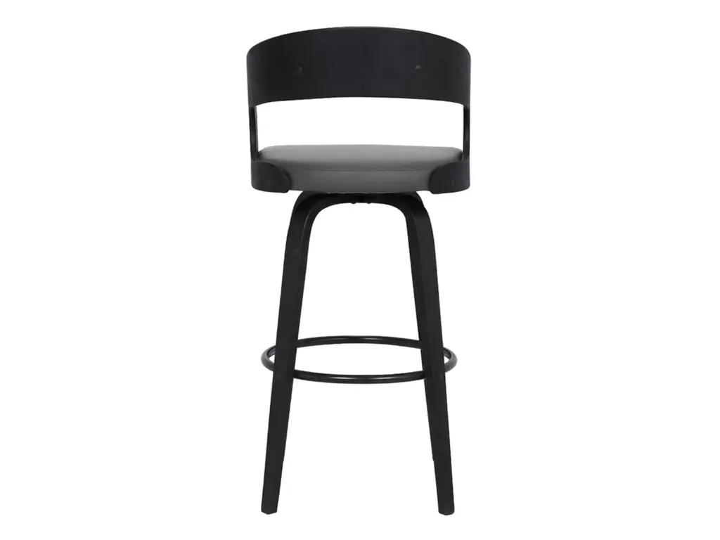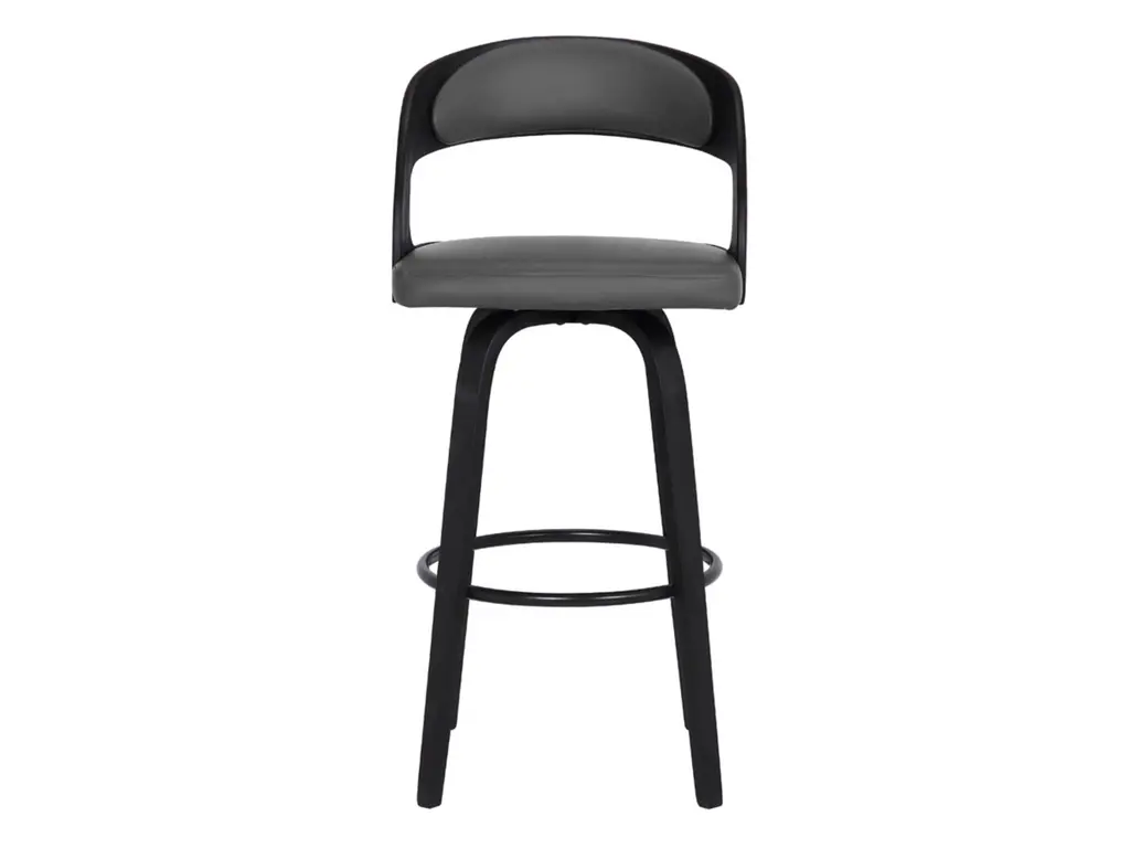 Add a touch of mid-century modern glamour to your home with the Shelly 26" Counter Height Swivel Gray Faux Leather and Black Wood Bar Stool from Armen Living. The retro silhouette exudes timeless appeal that would easily fit into any home regardless of the existing design theme. The Shelly kitchen stool features a beautiful wood frame and seat back that wrap around a luxurious high-density foam cushioned back and seat. Upholstered in soft faux leather upholstery, the Shelly provides a full mobility with a 360-degree swivel function that enables you to engage with your guests regardless of their place in the room at parties or gatherings, making this ideal for entertaining. The open seat back provides breathable seating and allows for easy movement around your home.