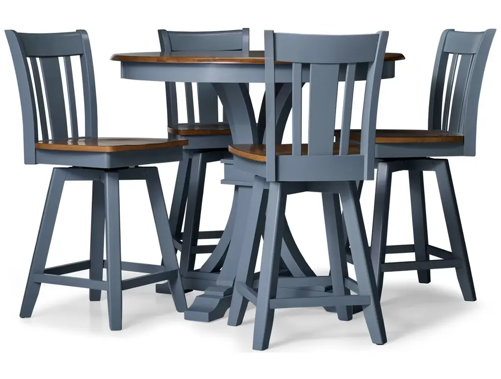 Give your dining space a fresh look with the JF Signature Sherwood Counter Height Table and 4 Stools. This traditional-style 5-piece dining set features a round table with a pedestal base ending in four feet. The set is completed by four matching swivel counter stools with slat backs, contoured seats, and footrests for added comfort. Available in other finishes.