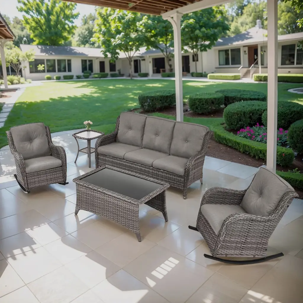 360¡ãSWIVEL AND ROCKING CHAIRS: You can easily turn your face away from the sun without moving the entire chair, or swing your seat like a cradle for the ultimate relaxation while listening to music or watching your children play outside. 3-Seat Outdoor Wicker Sofa PE Rattan Patio Couch with Thick Cushions,Deep Seat High Curved Back Armset Patio Sofa Outdoor Coffee Table for Patio Built-in 5mm black tempered glass table top,Anti-slip and easy to clean. Outdoor Ottomans for Patio Set of 2,Can be used as a footstool or perfectly complements outdoor patio chairs,or sofa sets.Also put the cushions away it can be pair of side tables. ¡¾Ergonomic Design¡¿ :The ergonomic high backrest and wide armrests design can provide you with more comfortable support.Suitable for outdoor or indoor use,porch garden poolside. ¡¾Deep Seating & Comfort Cushions¡¿: Deep and wide seats with 4-inch thick sponge-padded cushions. The cushions offers good resilience, not easy to deform or slide, also protect your lumbar and offer a comfortable sitting experience. ¡¾Sturdy and Durable¡¿:Anti-rust powder-coated steel frame and all-weather hand-Woven PE wicker to make this outdoor furniture set very durable and sturdy.UV protection, Make with hand weather-resistant PE rattan wicker furniture. ¡¾Easy to Assemble Free Warranty ¡¿ The patio furniture set comes with clear assemble instruction and all needed tools, easy to assemble by one person.Also we can provide assemble video if you need.Due to the large size, Our set will be divided into 4 boxes for delivery, and their arrival time may be different. Please wait patiently or contact us directly to provide the latest logistics information.