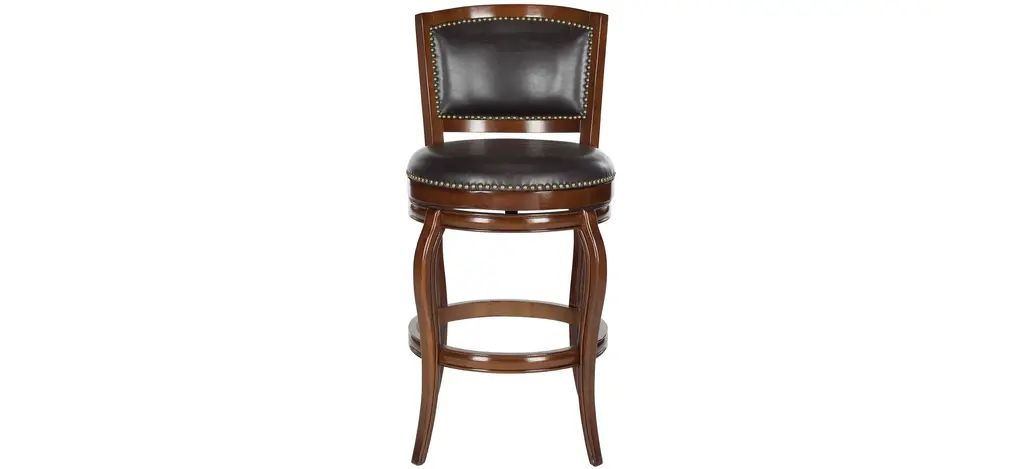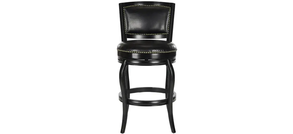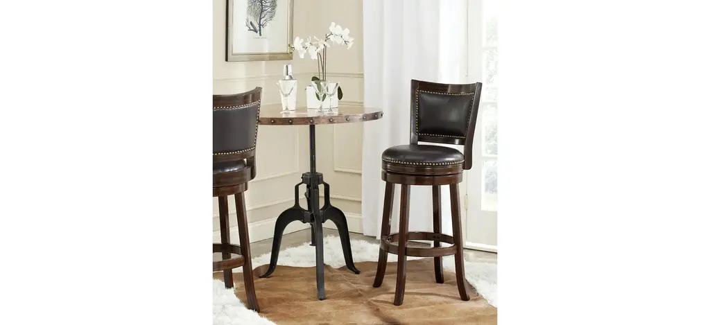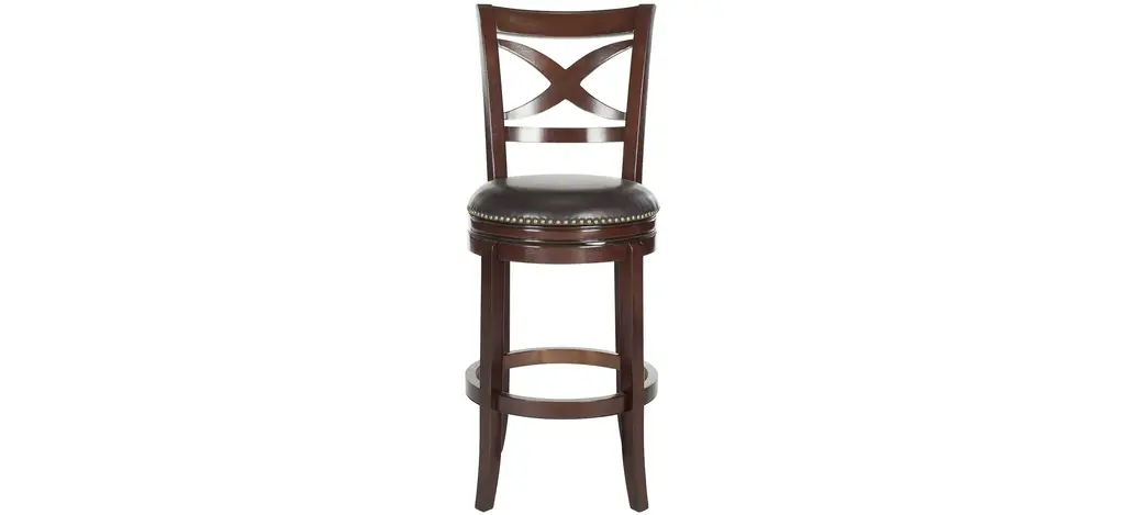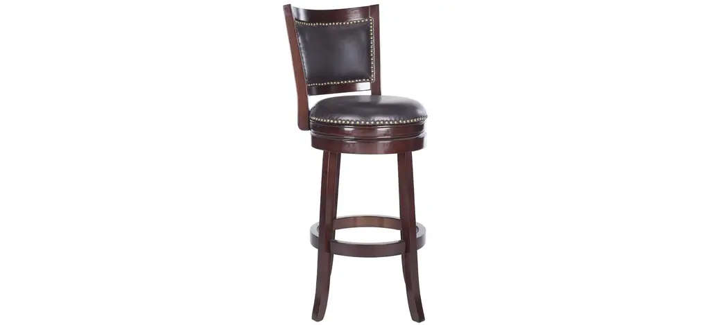 With its elegant low profile backrest, the Switzer Swivel Bar Stool is as comfortable as it is good looking. Upholstered with dark brown PU leather with bronze nailhead trim, this bar stool is crafted of eco friendly hardwood in a sierra brown finish.