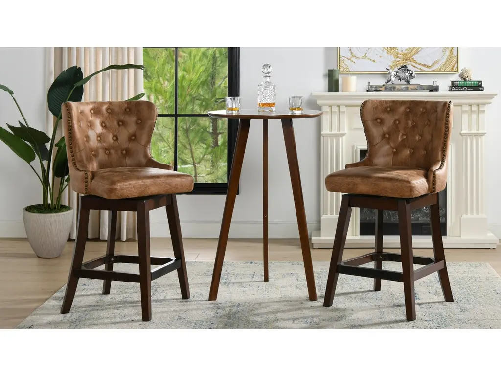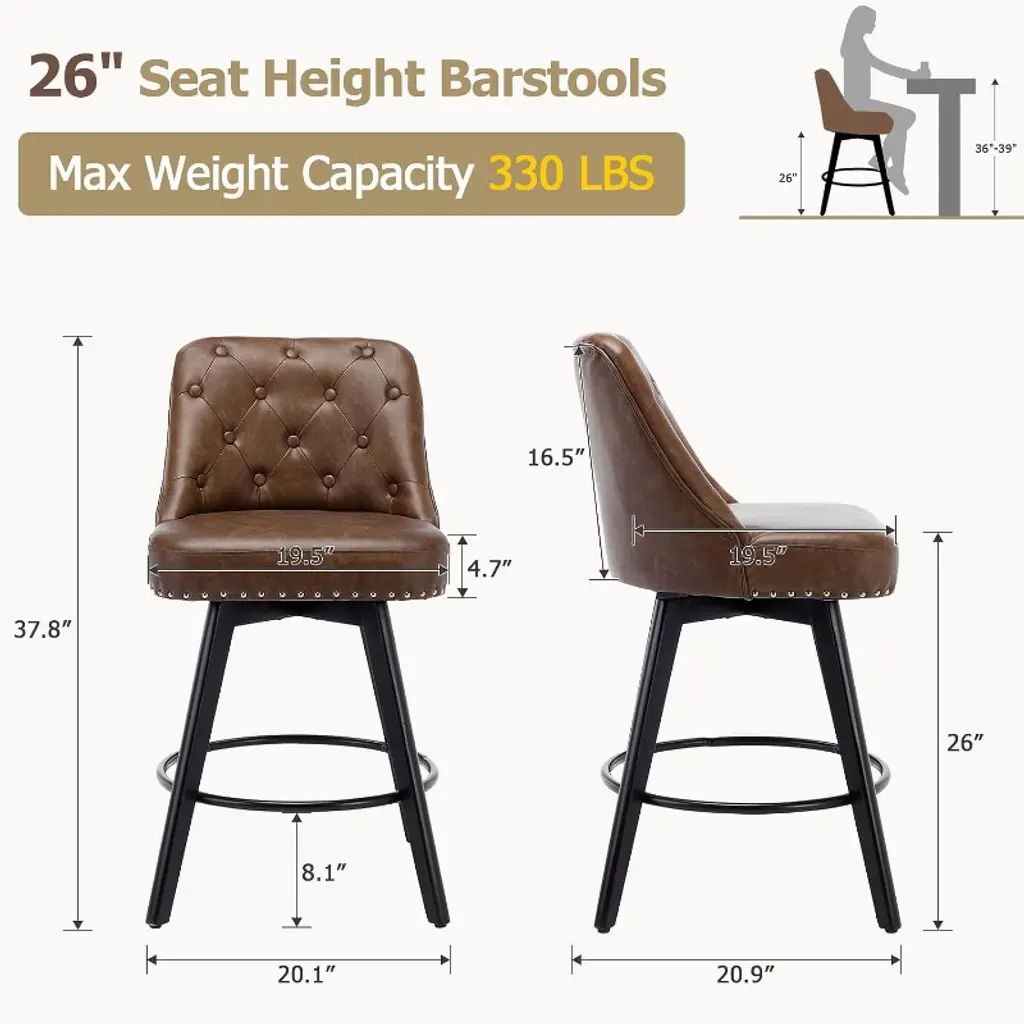360° Swivel for Easy Movement: Our bar stools feature a smooth 360° swivel function, allowing you to rotate effortlessly in any direction. Whether you're reaching for something, turning to chat, or adjusting your position, this feature adds convenience and flexibility, making it ideal for kitchens, home bars, cafes, and more. Plush Upholstered Seat for Comfort: The 4.7-inch thick high-elastic sponge seat provides exceptional comfort and support. Designed to rebound quickly after use, it ensures you stay relaxed even during long hours of sitting, whether for casual gatherings or formal occasions. Stylish Button-Tufted Design: With a deep button-tufted back and rivet-trimmed edges, these bar stools bring a touch of elegance and modern style to any space. Their versatile design complements a variety of decor styles, from industrial to traditional, making them a perfect addition to your home or business. Durable Solid Wood Legs & Fabric Options: Built with sturdy solid wood legs and a refined black finish, these stools are both durable and stylish. You can also choose between faux leather or linen upholstery to match your personal decor preferences. Easy Assembly and Low Maintenance: Setting up our bar stools is quick and hassle-free, thanks to clear instructions and included accessories. The durable materials are also easy to clean, making maintenance simple and saving you time and effort.