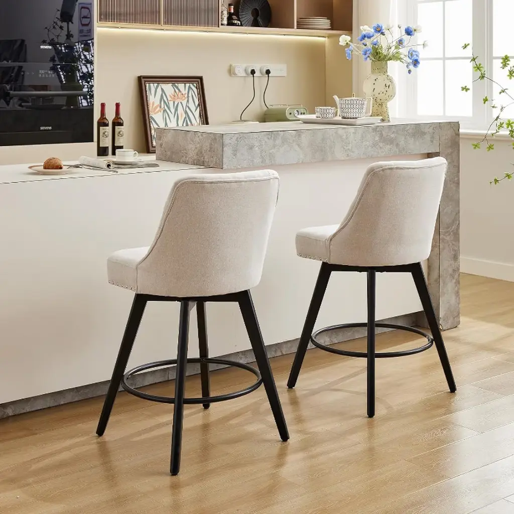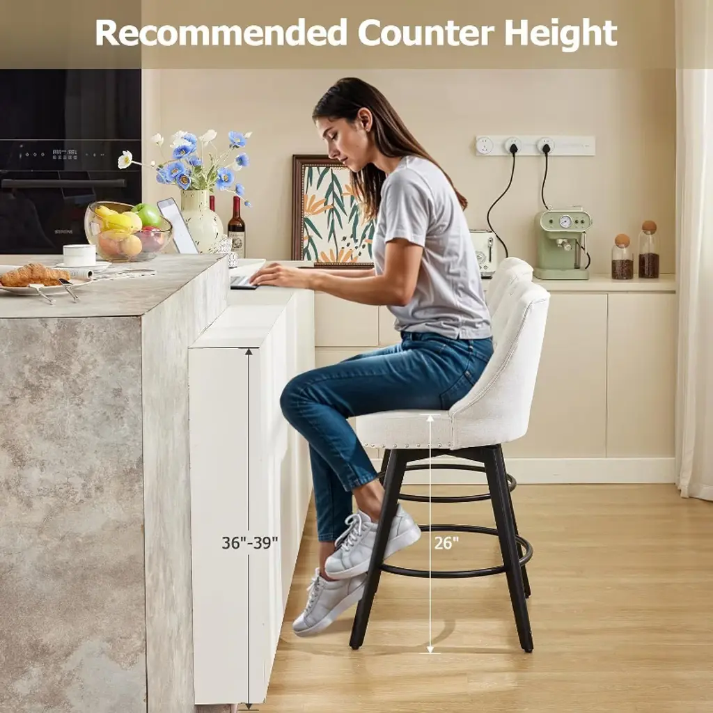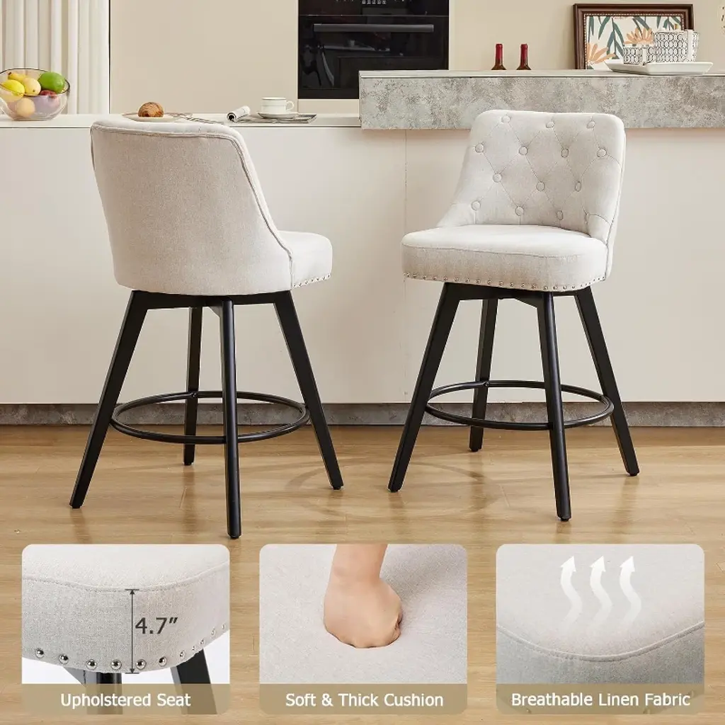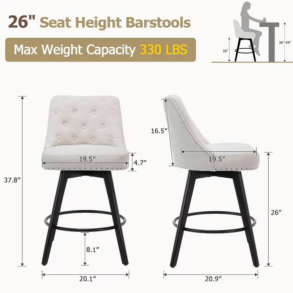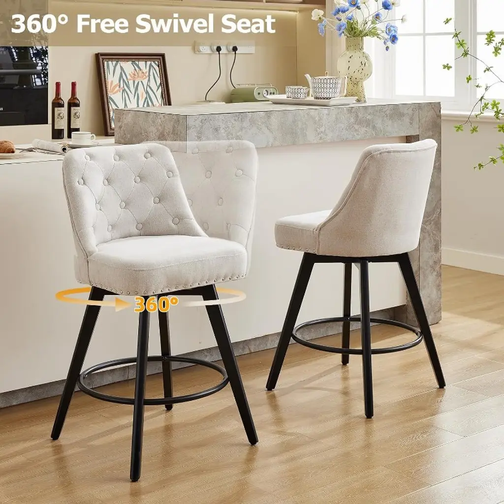 360° Swivel for Easy Movement: Our bar stools feature a smooth 360° swivel function, allowing you to rotate effortlessly in any direction. Whether you're reaching for something, turning to chat, or adjusting your position, this feature adds convenience and flexibility, making it ideal for kitchens, home bars, cafes, and more. Plush Upholstered Seat for Comfort: The 4.7-inch thick high-elastic sponge seat provides exceptional comfort and support. Designed to rebound quickly after use, it ensures you stay relaxed even during long hours of sitting, whether for casual gatherings or formal occasions. Stylish Button-Tufted Design: With a deep button-tufted back and rivet-trimmed edges, these bar stools bring a touch of elegance and modern style to any space. Their versatile design complements a variety of decor styles, from industrial to traditional, making them a perfect addition to your home or business. Durable Solid Wood Legs & Fabric Options: Built with sturdy solid wood legs and a refined black finish, these stools are both durable and stylish. You can also choose between faux leather or linen upholstery to match your personal decor preferences. Easy Assembly and Low Maintenance: Setting up our bar stools is quick and hassle-free, thanks to clear instructions and included accessories. The durable materials are also easy to clean, making maintenance simple and saving you time and effort.