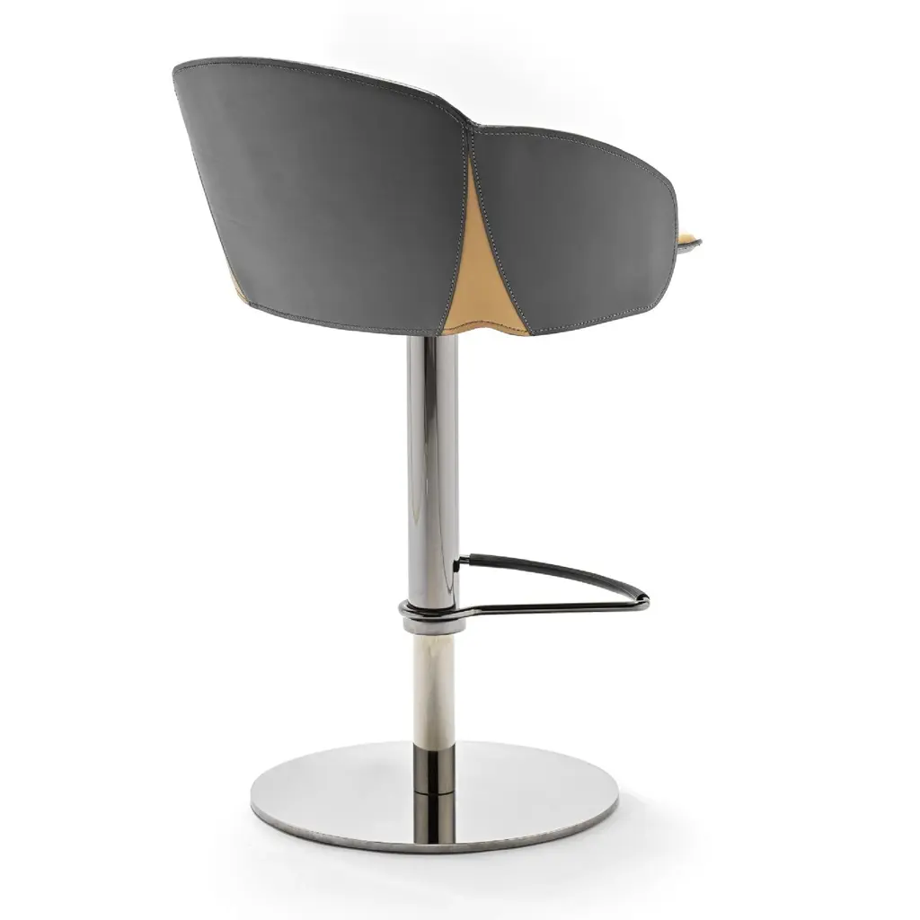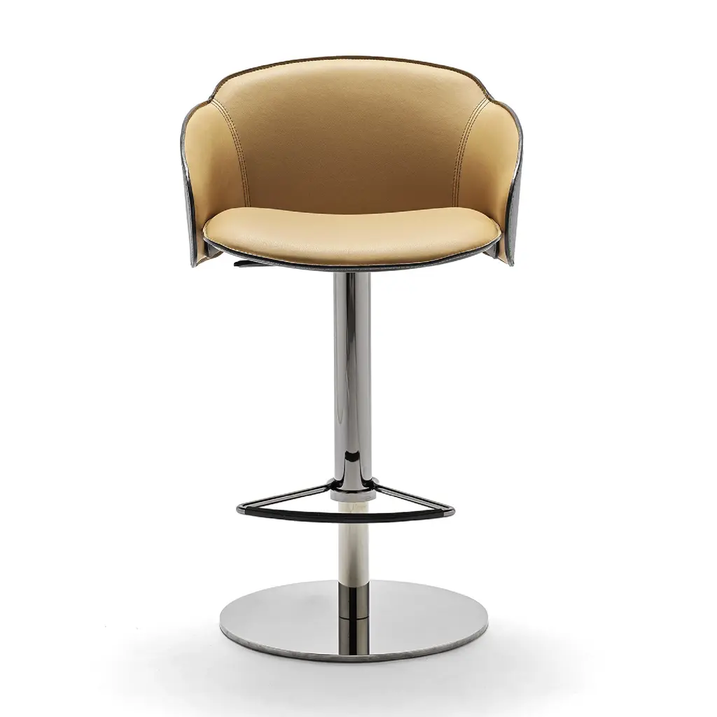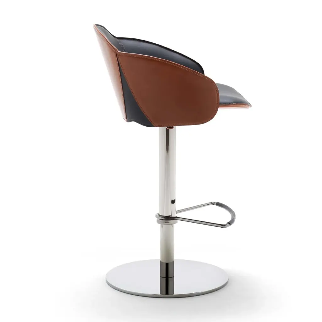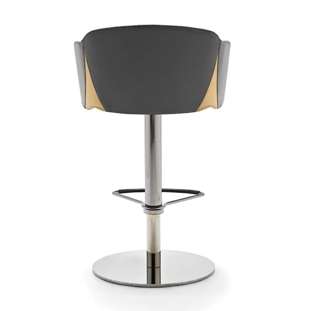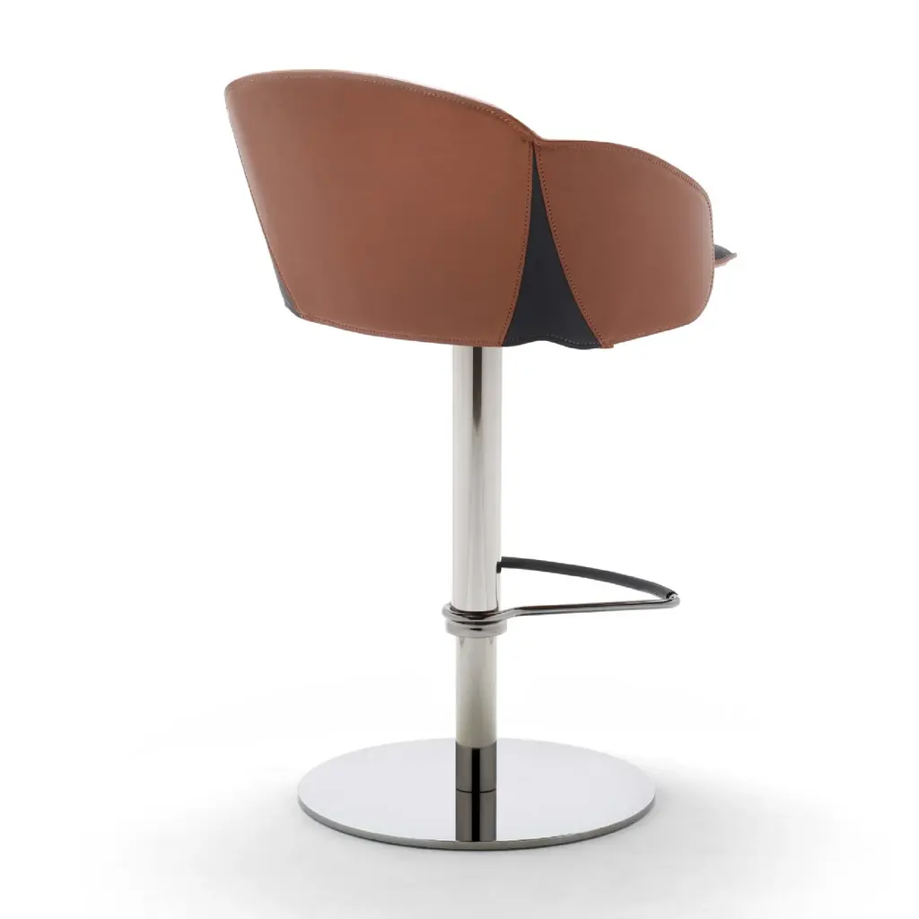 The Electa Bar BT is a swivel stool with a round steel disk base, featuring a gas height adjustment and a footrest. The structure is made of steel in various finishes. The backrest is steel, while the seat is crafted from layered beech wood, fully padded and upholstered internally in premium leather and externally in full-grain leatherwith notable external side details in leather. It is also available in a version fully upholstered in premium leather. Color finishes can be tone-on-tone or contrasting in both versions, making it an eye-catching addition for both commercial spaces and residential settings.