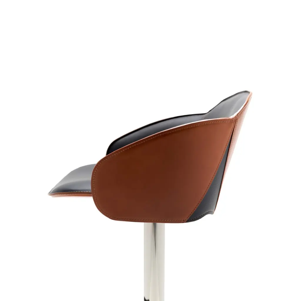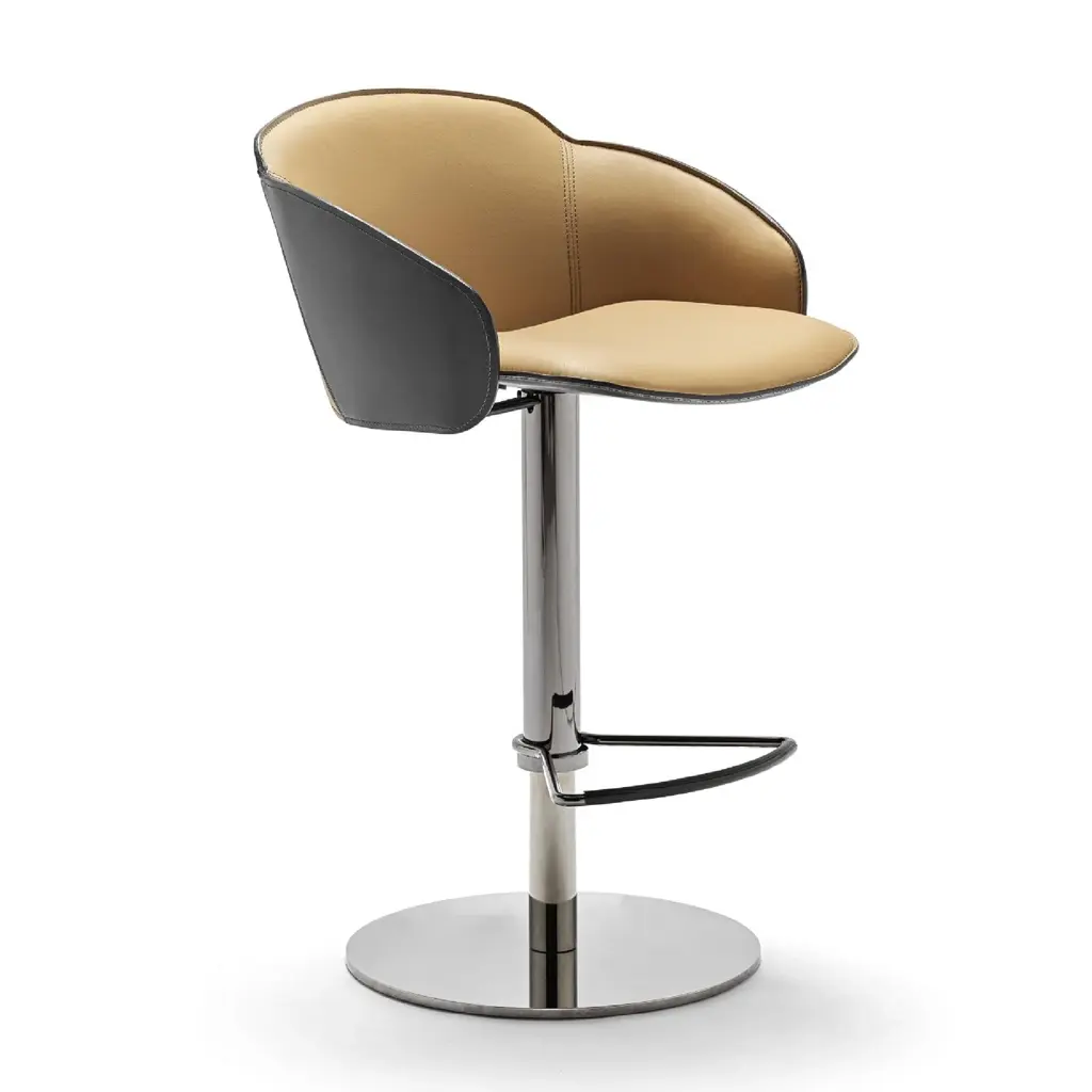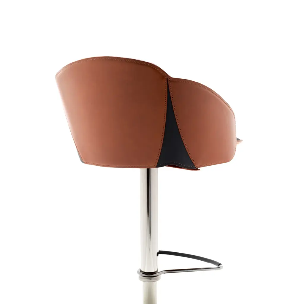 The Electa Bar BT is a swivel stool with a round steel disk base, featuring a gas height adjustment and a footrest. The structure is made of steel in various finishes. The backrest is steel, while the seat is crafted from layered beech wood, fully padded and upholstered internally in premium leather and externally in full-grain leatherwith notable external side details in leather. It is also available in a version fully upholstered in premium leather. Color finishes can be tone-on-tone or contrasting in both versions, making it an eye-catching addition for both commercial spaces and residential settings.