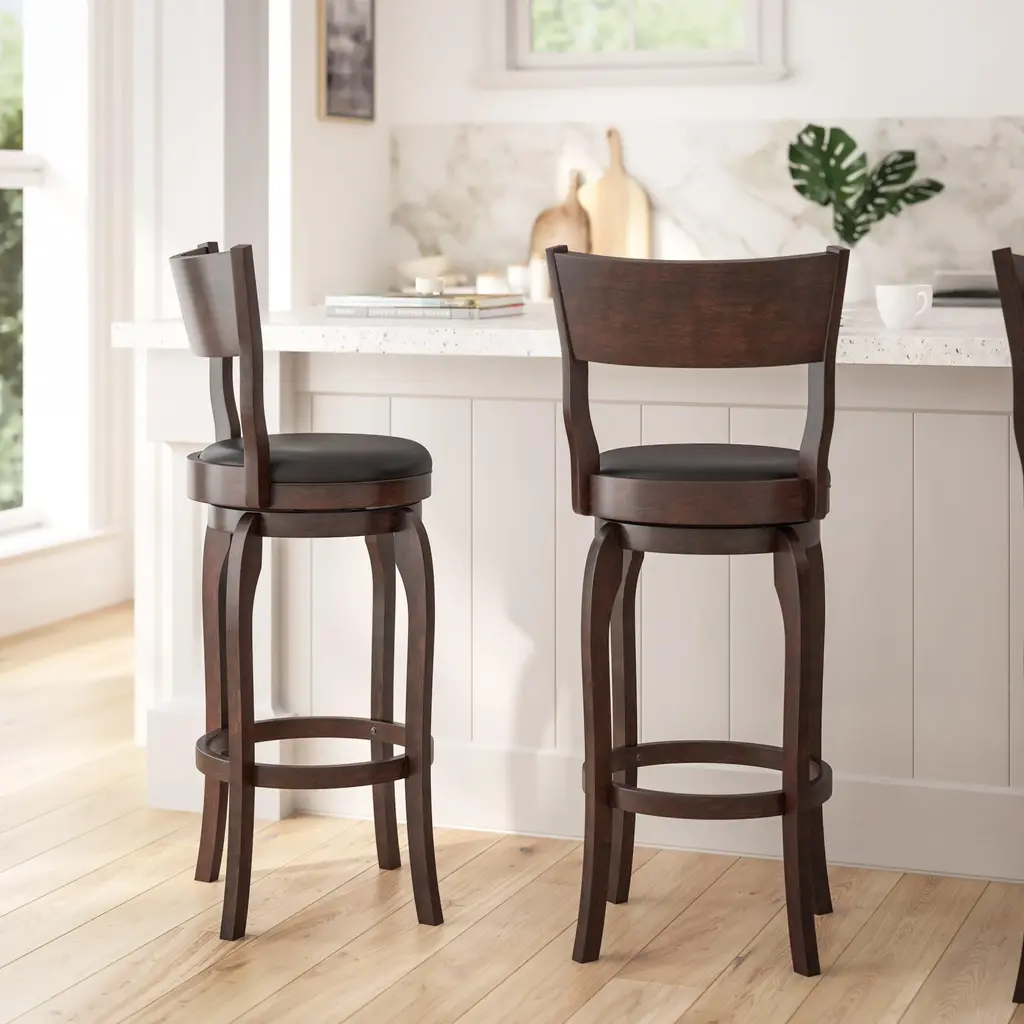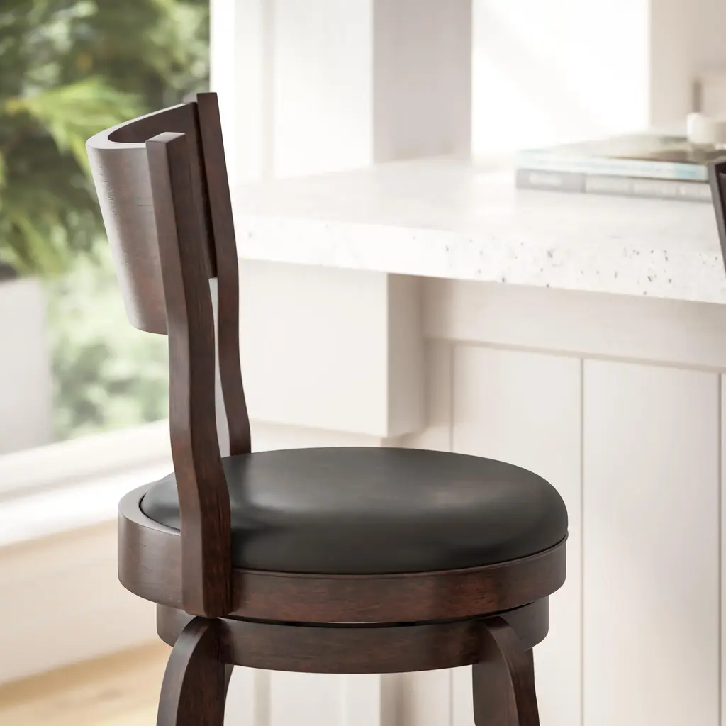Old world charm abounds in this classic style bar height stool ideal for your kitchen island, dining room, or as extra seating. The richly hued wood grain look, available in 2 finishes, creates a warm, inviting ambiance ideal for any living space. Constructed of solid wood, boasting 360° swivel, and an integrated footrest for additional comfort, this chair provides a comfortable and stable seating experience.