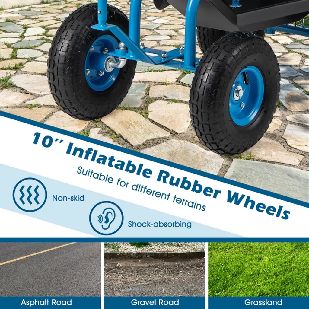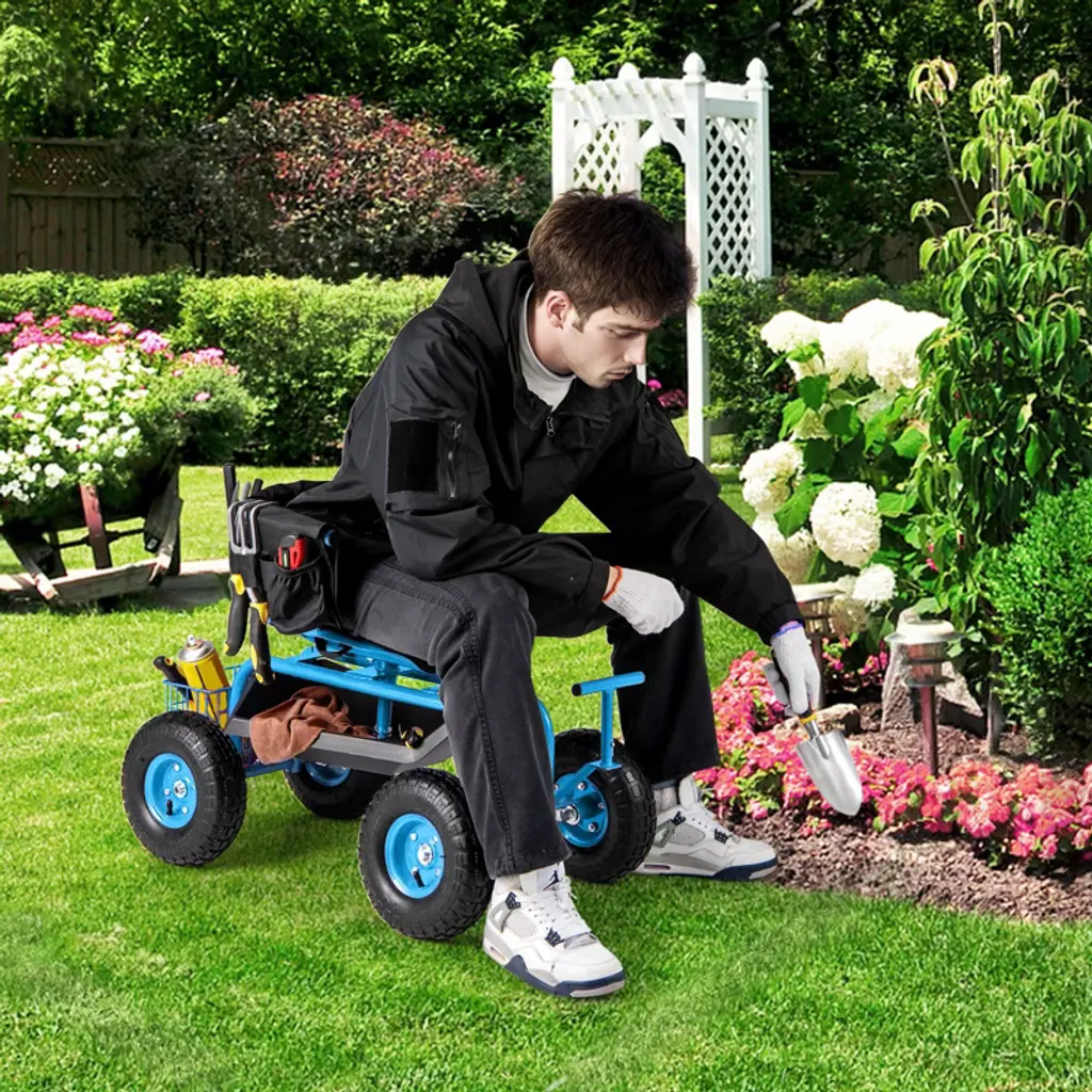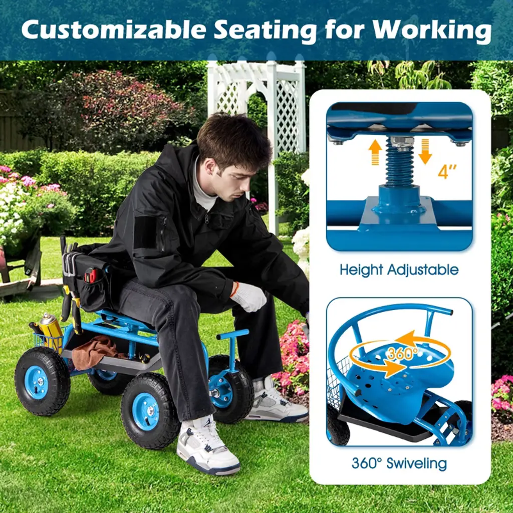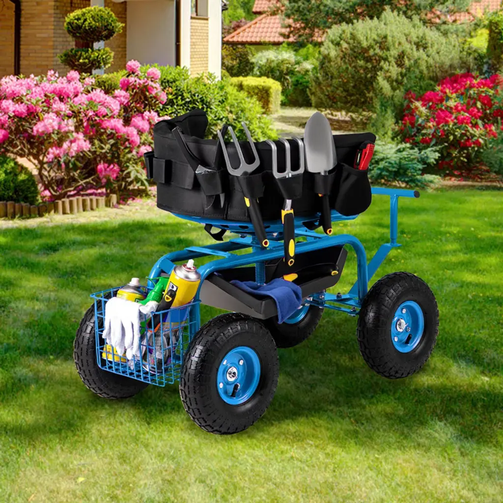 A garden cart with seat that enhances both the efficiency and enjoyment of gardening jobs! Featuring a height adjustable 360° swiveling seat, the garden cart scooter ensures that you can reach all areas of your garden without straining your back. Unlike other carts on the market, ours comes with a seat and back cushion, designed to provide you with the utmost comfort while you tend to your plants. The removable back cushion further enhances your experience by offering storage partitions to organize your gardening tools efficiently. The added storage basket and tool tray allow you to keep everything need within arm's reach. The cart is equipped with 4 inflatable rubber tires that glide effortlessly on various surfaces including grassland, asphalt road, and gravel roads. Moreover, the 2 steering handles in different lengths make it a breeze to maneuver the cart. Whether tending to flower beds, harvesting vegetables, or conducting landscaping tasks, the rolling stool cart will simplify your gardening activities. FeaturesHeight adjustable design will offer customizable seating for working360° swiveling seat allows you to effortlessly pivot and reach all areas of your gardenErgonomic seat is equipped with a removable padded cushion to relieve the fatigueCurved backrest cradles your waist comfortablyFeaturing a storage basket, tool tray and tool holders to keep the essential tools in placeSpecifications: Color: Green, Blue, Red Material: Metal, Rubber Overall Dimension: 35.5" x 23" x 41"/90 cm x 59 cm x 106 cm (L x W x H) Handle Length: 4.5"/11.5 cm, 24"/60 cm Dimension of Basket: 9.5" x 5" x 6.5"/24 cm x 13 cm x 17 cm (L x W x H) Seat Size: 18" x 13.5"/45 cm x 34 cm (L x W) Dimension of Tool Tray: 16.5" x 14"/42 cm x 36 cm (L x W) Adjustable Height of Seat: 16.5"-20.5"/42 cm-52 cm Diameter of Wheel: 10"/26 cm Width of Wheel: 3"/8 cm Net Weight: 34 lbs/15 kg Max Weight Capacity: 330 lbs/150 kg Package includes: 1 x Garden Cart Workseat 1 x User Guide