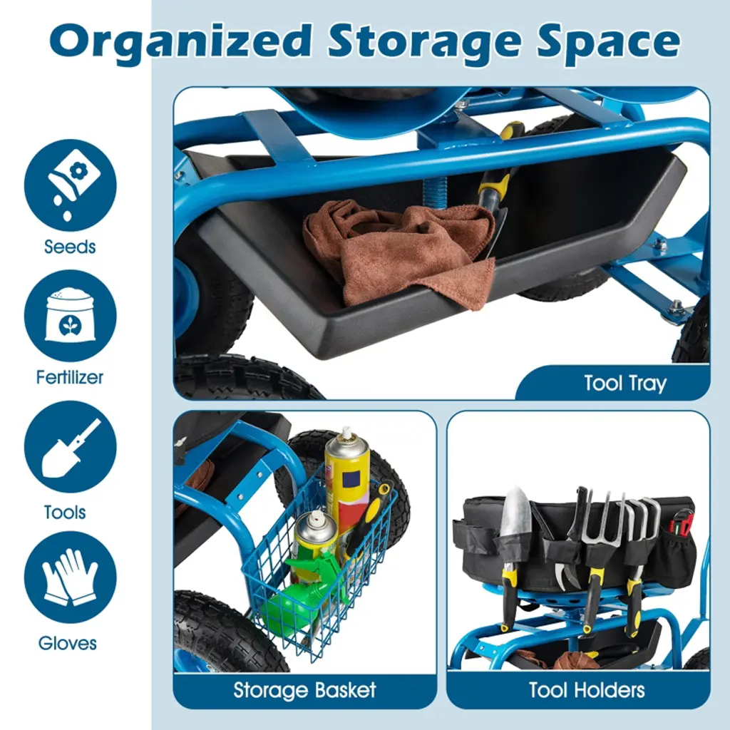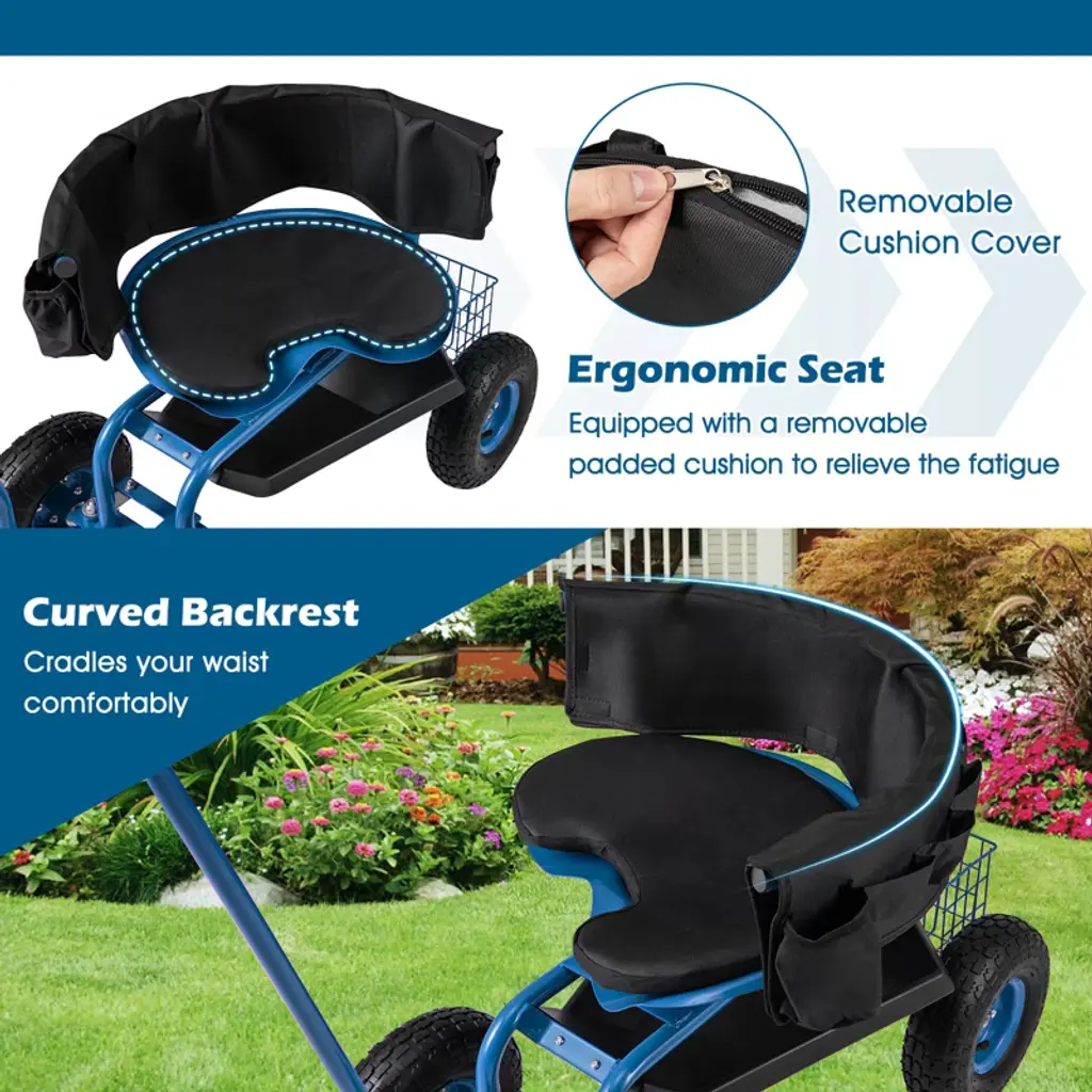 Tangkula Rolling Garden Cart Work Seat Height Adjustable Swivel Stool Cart With Removable Cushion & 2 Steering Handles Blue
