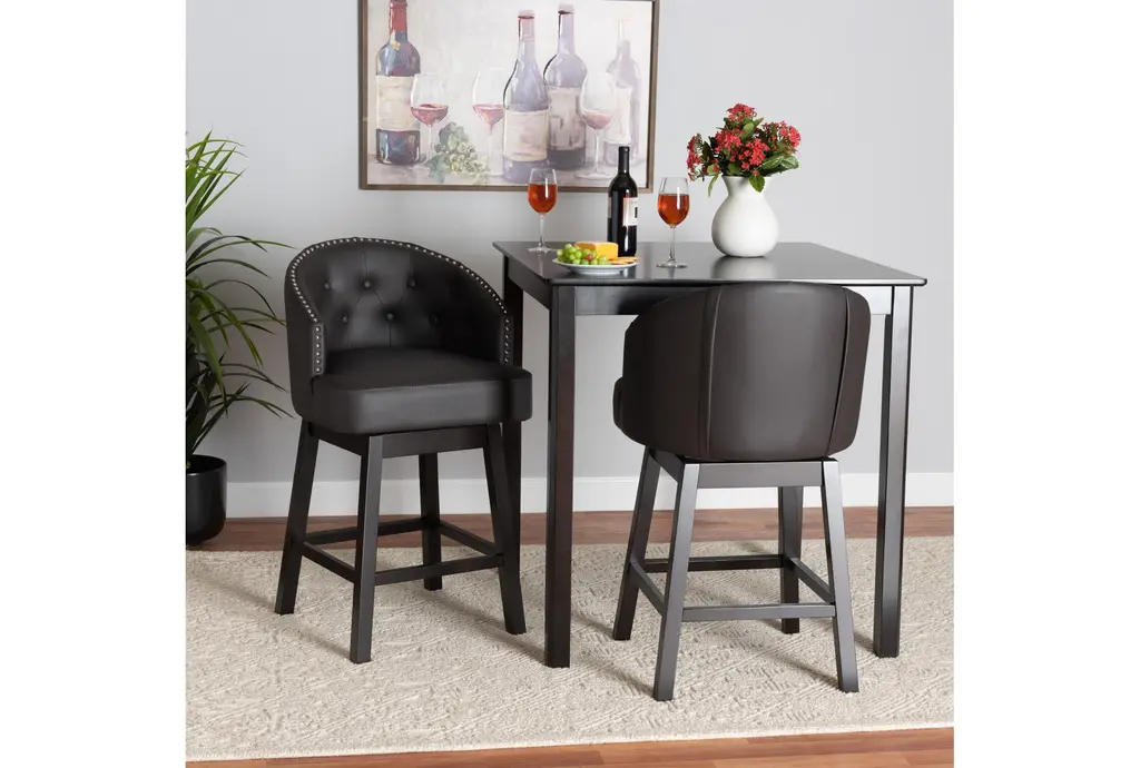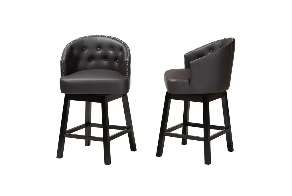 Introduce a touch of mid-century modern style to your dining or kitchen area with the Theron Mid-Century Dark Brown Faux Leather & Espresso Brown Wood Swivel 27" Counter Height Stool Set Of 2. These stools blend dark brown faux leather with espresso brown wood, creating a sophisticated and timeless look. The swivel feature and tufted design offer both comfort and functionality, perfect for any contemporary or classic space.