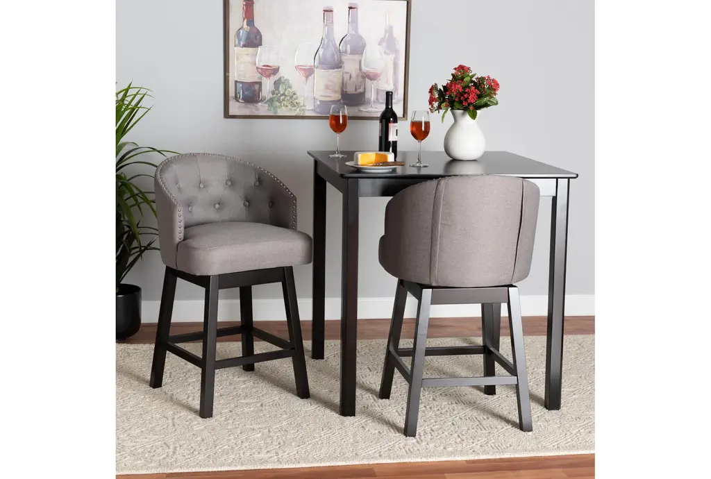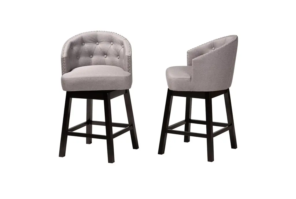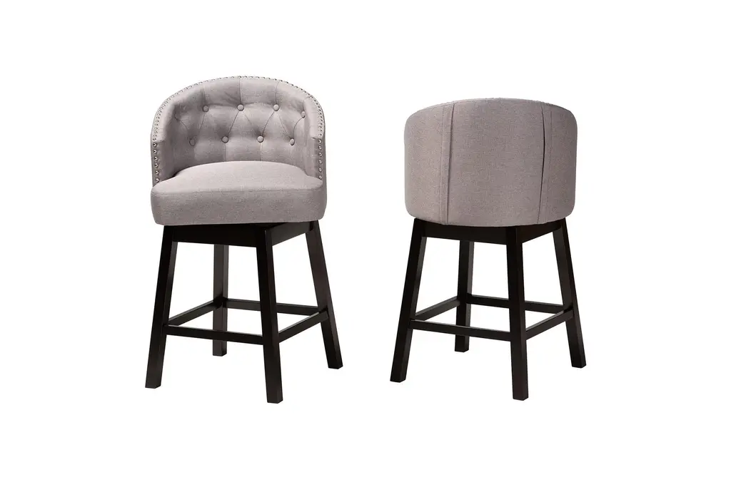 The Theron Mid-Century Grey Fabric Upholstered & Espresso Brown Wood Swivel Counter Height Stool Set of 2 brings a touch of retro charm to your dining room or kitchen. Featuring a comfortable tufted backrest, these stools offer both style and functionality. The swivel design allows for easy movement, making them perfect for social gatherings and daily use.