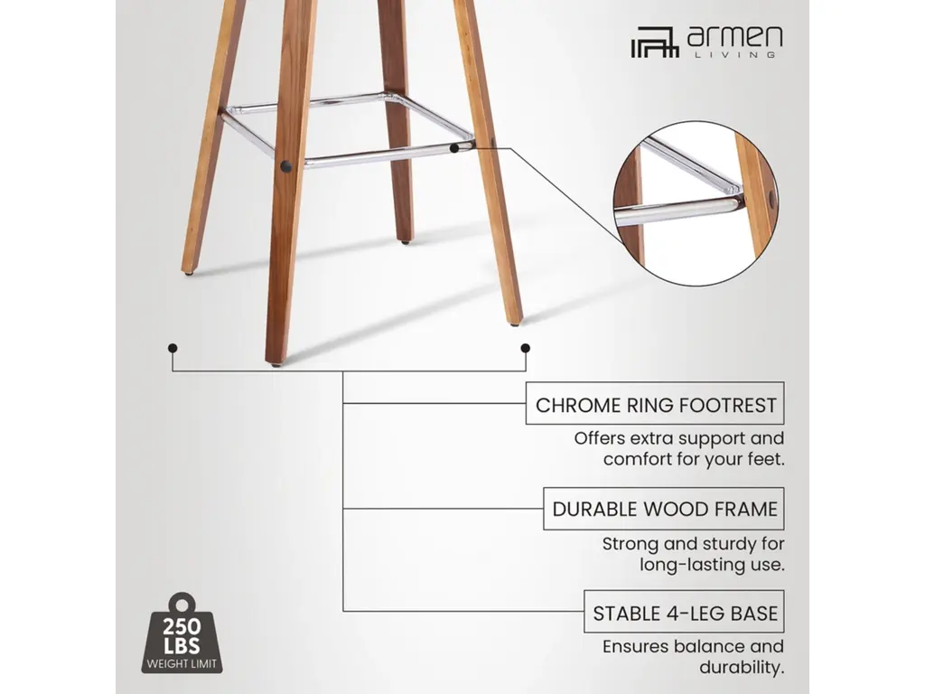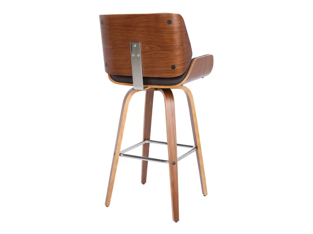 The Armen Living Tyler mid-century barstool is a standout in any contemporary household setting. The Tyler's beautiful walnut wood frame is perfectly accented by its faux leather upholstered seat and back. The Tyler is wonderfully versatile, sporting a stylish yet practical appearance as well as a 360 degree swivel function for exceptional mobility. The Tyler is available in 26 inch counter and 30 inch bar height with brown faux leather.