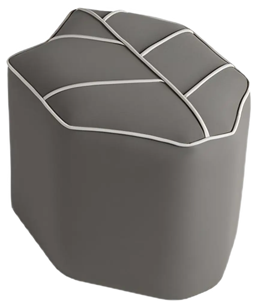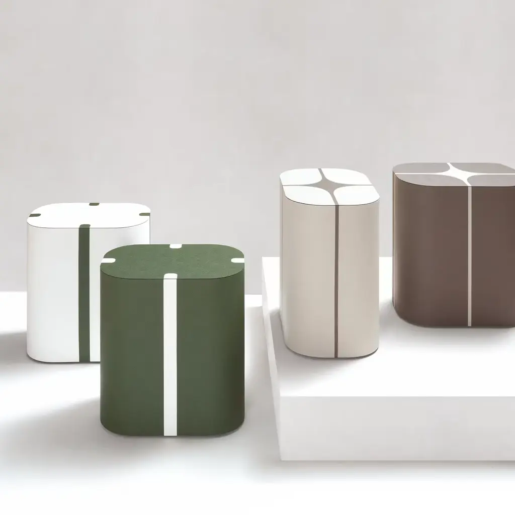 Designed by Stéphane Parmentier and available with two inlaid patterns (side and cross lines), this Art Deco-inspired stool can also be used as a side table and displayed in multiples in coordinating color palette. Covered in soft chestnut brown leather with ivory cross inlay, the base of this unique rounded-corner stool is raised slightly from the ground and equipped with hidden swivel castors which allow it to be moved easily.