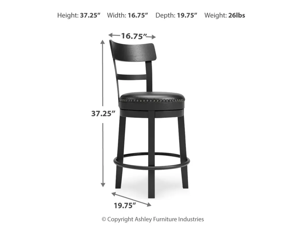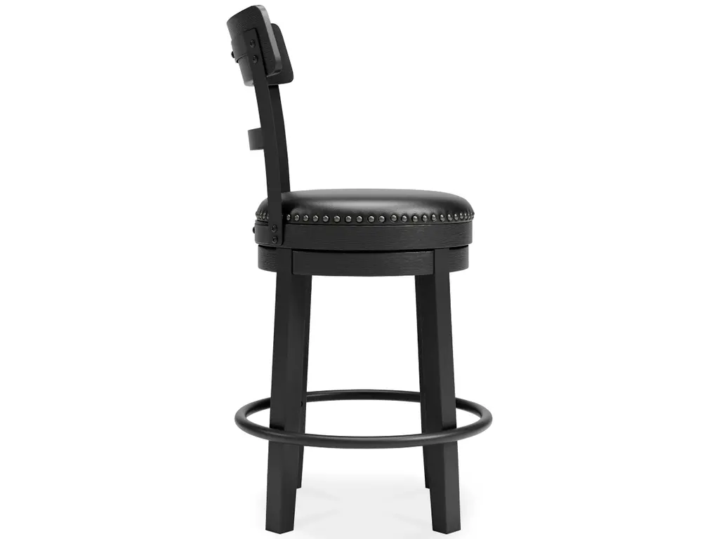 Bring a dash of drama to a kitchen island, table or counter with the Valebeck upholstered swivel bar stool. The sturdy wood frame with contoured backrest is beautified with an antiqued black finish that’s a welcome change from the everyday ordinary. For your comfort and convenience, the bar stool seat is covered in a durable black faux leather designed for easy cleanup. Nailhead trim and metal accents perfect the aesthetic of this head-turning bar stool with 360-degree swivel.