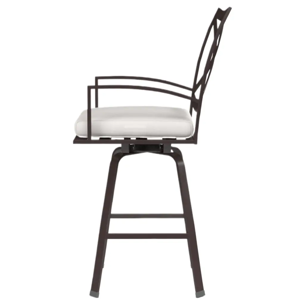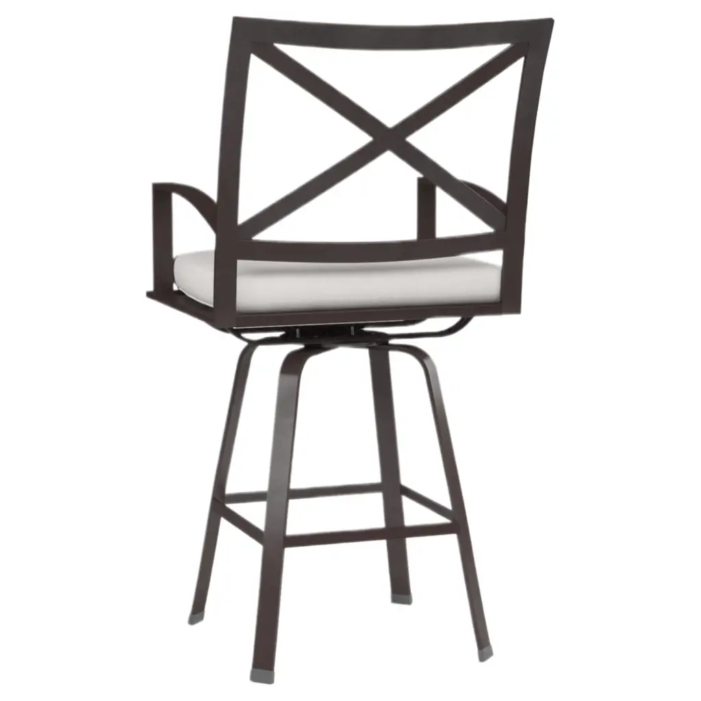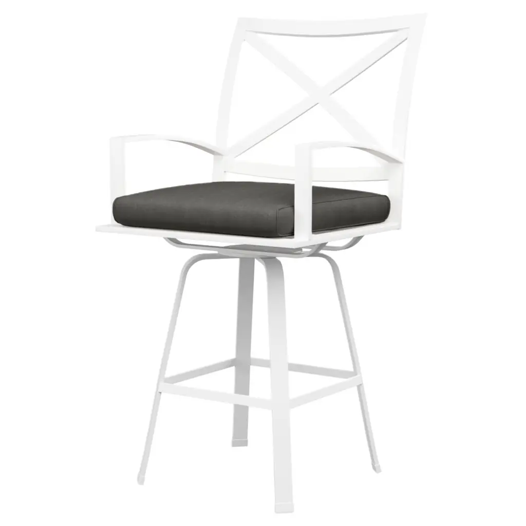 The Ventura Swivel Barstool is crafted from high-quality, low-maintenance aluminum designed to endure over time. This stool features a gently curved X back and a seat scaled for comfort, complete with a swivel base and subtly curved arms. It pairs excellently with the Ventura Pub Table. The stool boasts a fully welded, scratch-resistant powder-coated aluminum frame, weather-resistant high-resiliency foam cushions, and commercial quality construction.