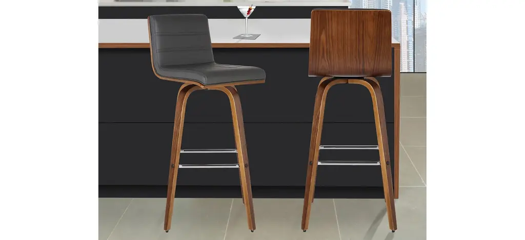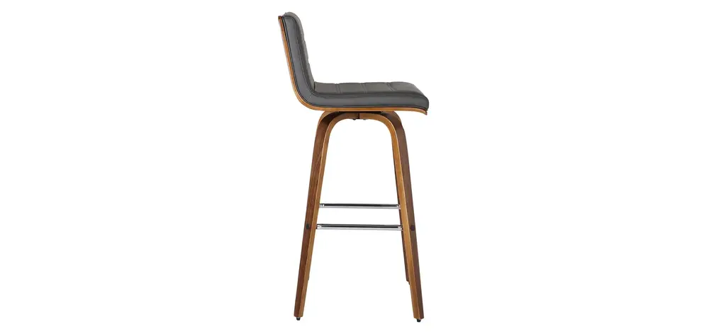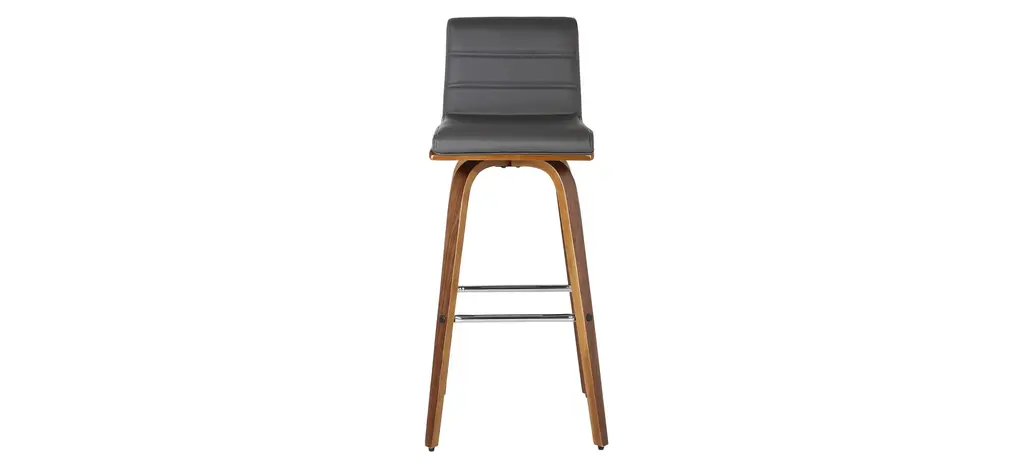 Indulge in luxury with the Vienna swivel counter stool. It is beautifully designed with a sturdy metal-framed footrest, a walnut wood finish, gray leather-look upholstery and a walnut back. This piece provides both versatile style and comfort with a Mid-Century Modern design that can easily be integrated into your home's current decor.
