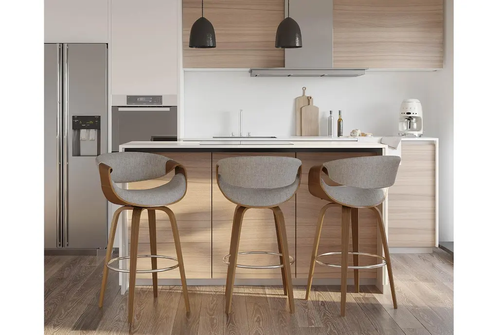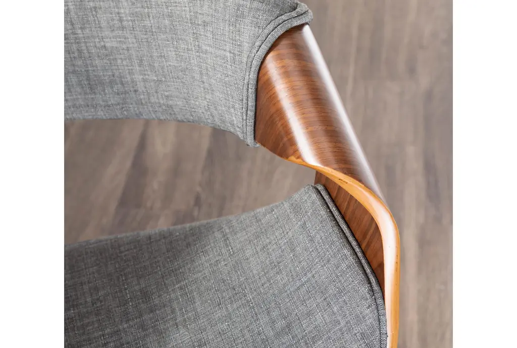 Enhance your kitchen or dining area with the Vini Curve 30" Bar Stool with Swivel in Walnut Wood and Grey Upholstered Set of 2. These stools feature a sleek Mid-Century Modern design, combining comfort and style with their curved bentwood armrests and 360-degree swivel functionality. The grey fabric upholstery adds a touch of elegance, making them a perfect addition to any contemporary space.