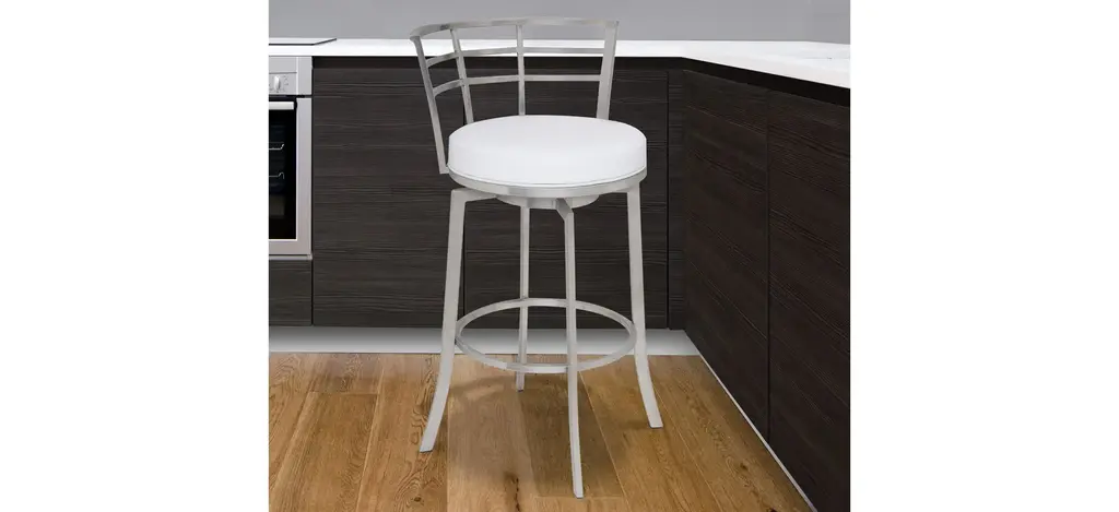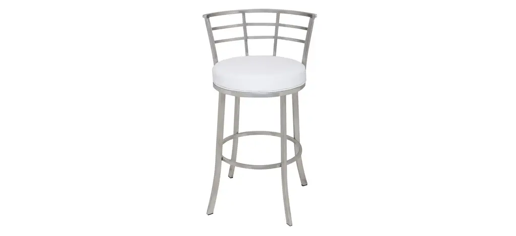 The Viper swivel counter stool is sleek and modern with a plush, comfortable, well-cushioned white leather-look seat. The compact style allows it to fit into smaller areas, making it well suited for an intimate home bar or kitchenette. The brushed stainless-steel finish gives it a modern style all its own. This contemporary counter stool also offers the ability to swivel side to side.
