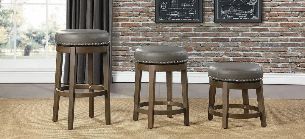 Transitional styling paired with versatility of selection makes the Whitby stool a perfect addition to your home's casual dining spaces. The round, swivel seat, stool is presented at 18-inches. The brown finished wood legs complement the gray faux leather seat which features nailhead trim that further defines the stool's round profile.