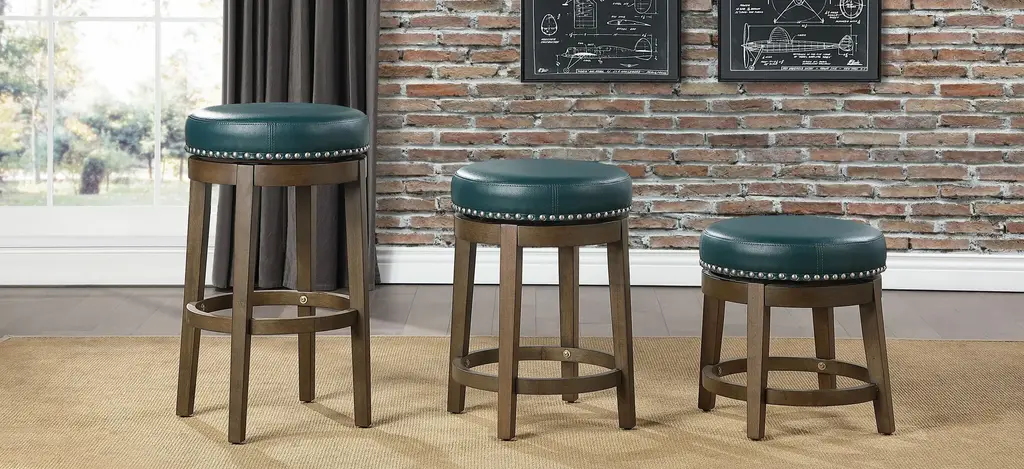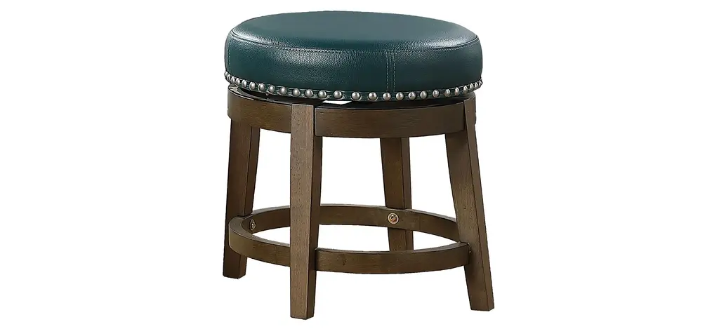 Transitional styling paired with versatility of selection makes the Whitby stool a perfect addition to your home's casual dining spaces. The round, swivel seat, stool is presented at 18-inches. The brown finished wood legs complement the green faux leather seat which features nailhead trim that further defines the stool's round profile.