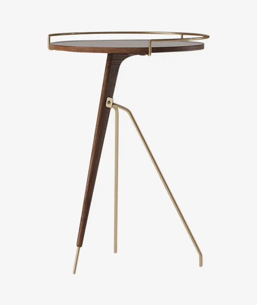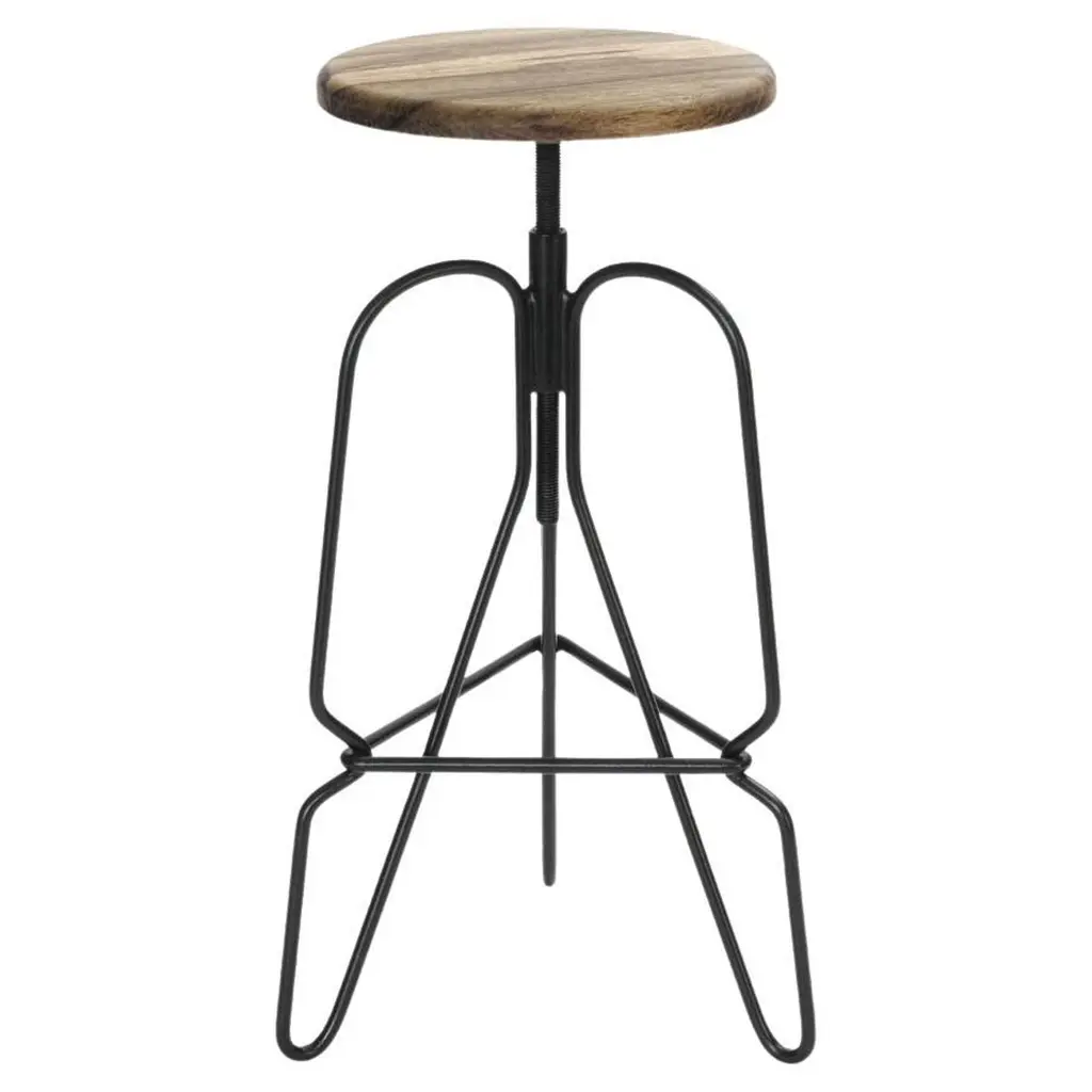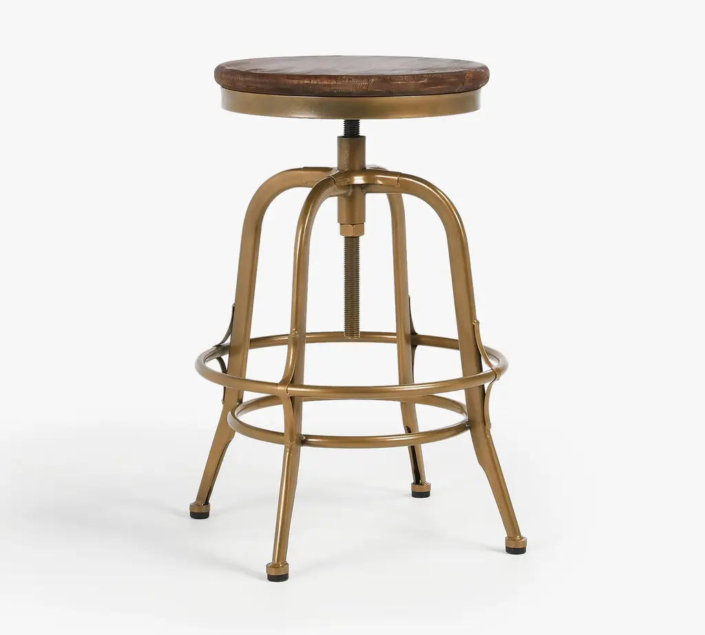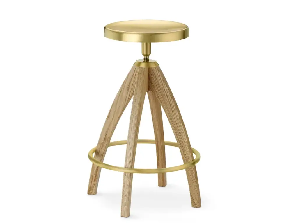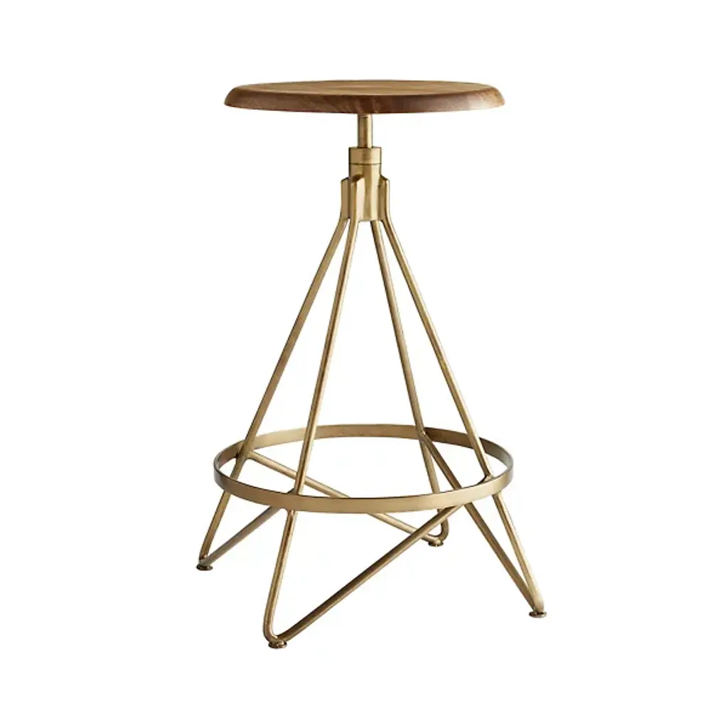 Counter stool with tube shaped triangular iron legs in vintage brass finish with round wooden swivel seat in distressed wax finish.