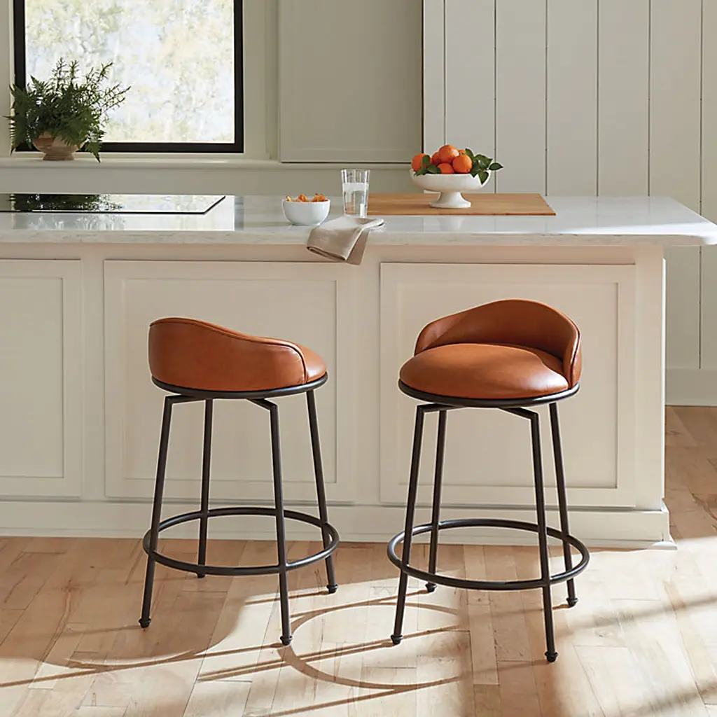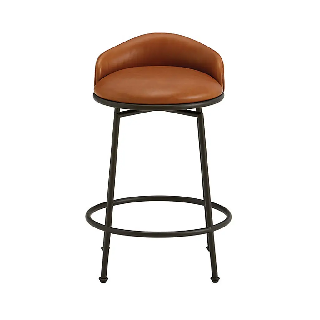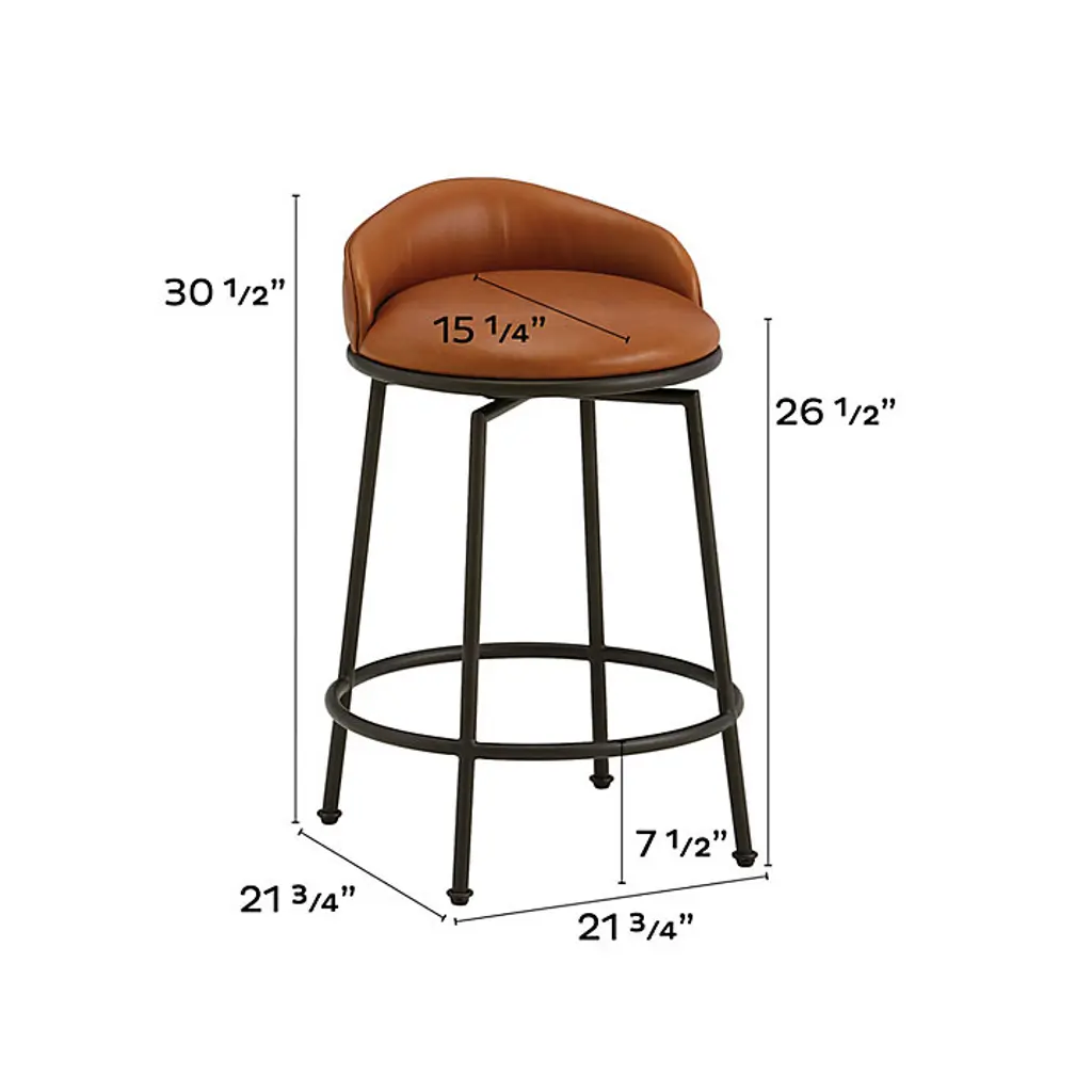 Inviting modern curves and swiveling comfort for your kitchen counter crowd. Our Zion Counter Stool features a round, generously padded seat and low curved back expertly upholstered in supple, cognac leather. Seat swivels for easy on-boarding and conversation. The oil rubbed bronze frame is sculpted of iron with slender legs and wrap-around footrest echoing the seat's circular shape. Zion Counter Stool features: