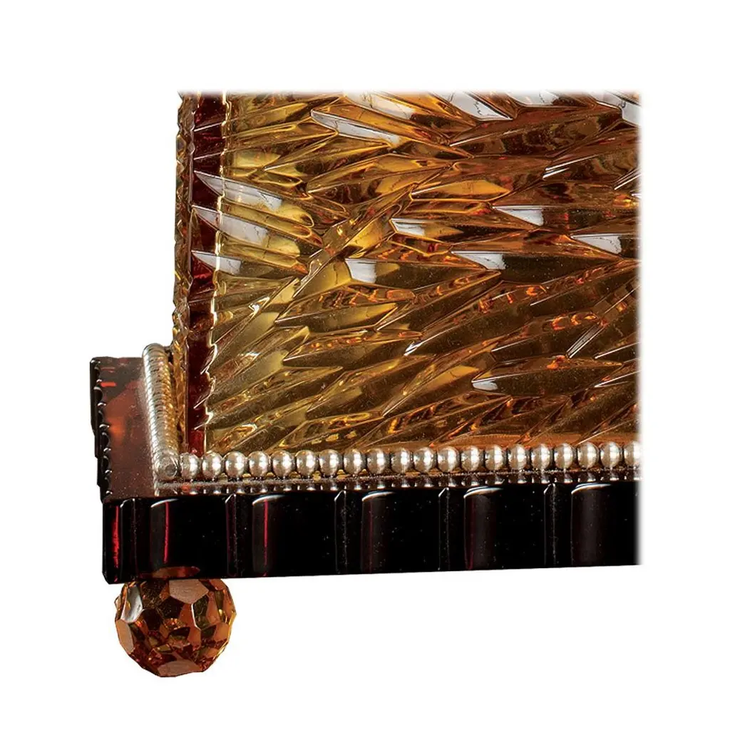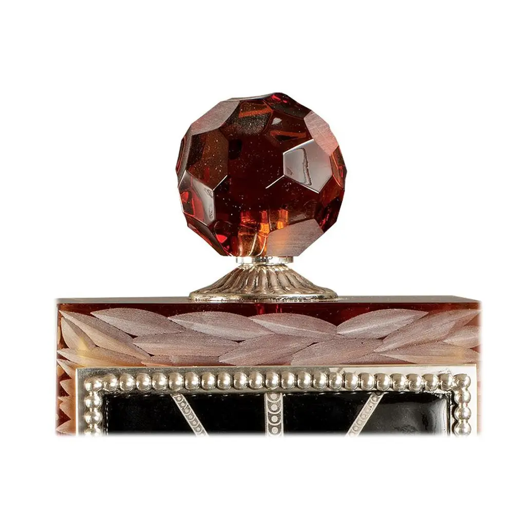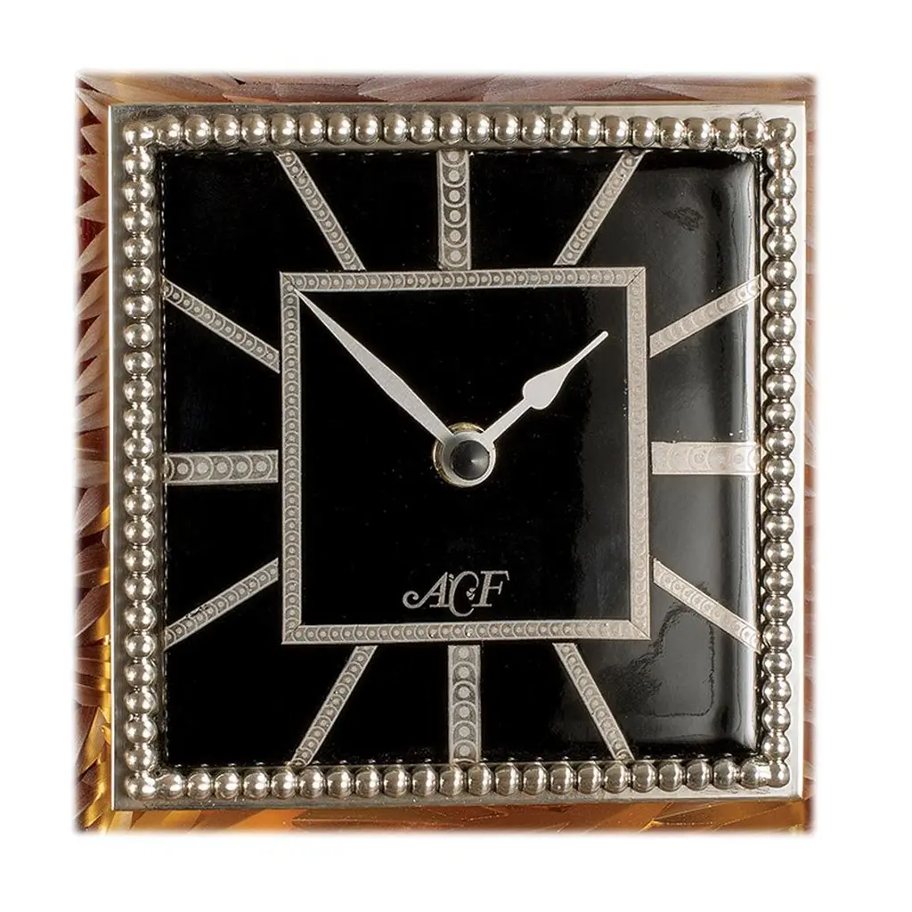 21st century Hand carved amber crystal and silver bronze clock. This clock is in hand-carved amber crystal and the dial is in black porcelain decorated in platinum. This clock has a quartz movement. On request to customer can modificate the color of crystal: pink, amber, amethist etc and we can change also the metal finishing: french gold, burnished, dark burnished, antique silver and patinated gold so you can match it with any decor. The style of this clock is classic and can be inserted in the best possible way within every furniture.Each object is handcrafted and the care for every detail makes each item unique in its kind.Also Oggetti d'Arte will follow with the same passion the request of the most qualified studies of interior architecture from around the world, helping them in achievement of their most ambitious projects.
