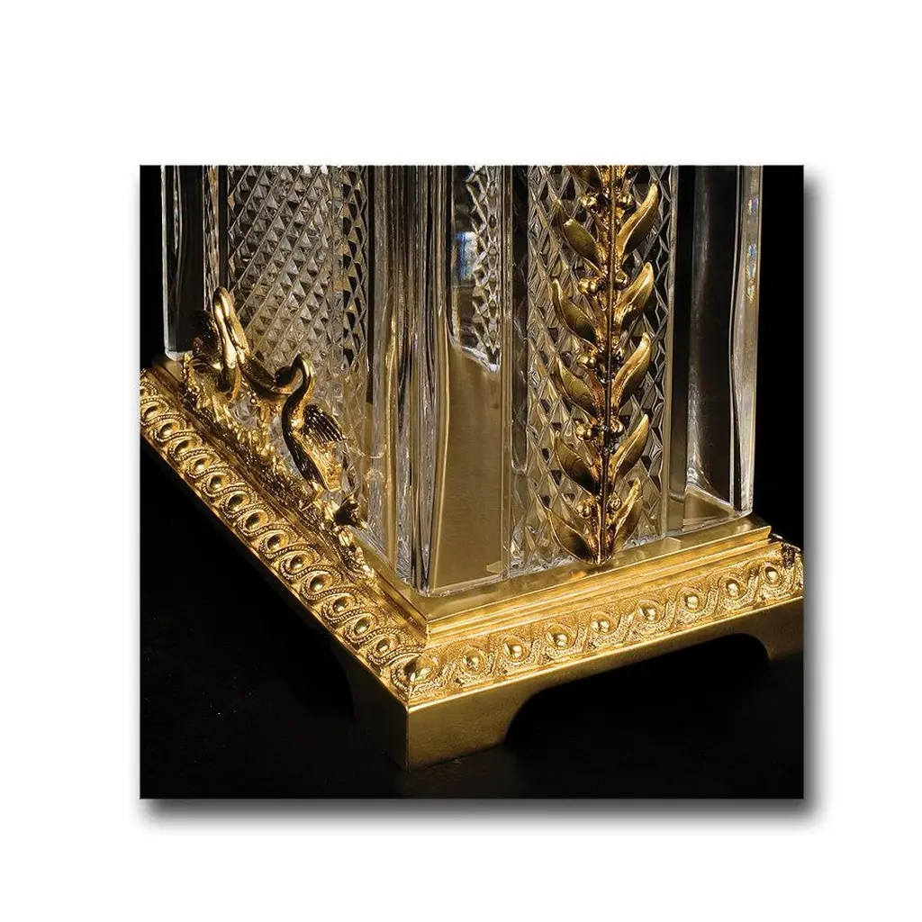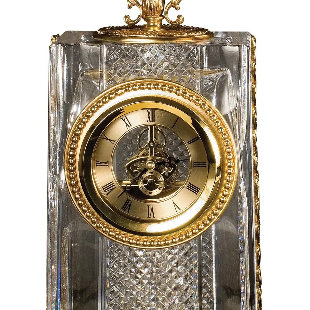 21st century Hand carved clear crystal and golden bronze clock. This clock is in hand-carved clear crystal. This clock has the quarts and mechanical movement. On request to customer can modificate the color of crystal: pink, amber amethist etc and we can change also the metal finishing: french gold, burnished, dark burnished, antique silver and patinated silver so you can match it with any decor. The style of this clock is classic and can be inserted in the best possible way within every furniture.Each object is handcrafted and the care for every detail makes each item unique in its kind.Also Oggetti d'Arte will follow with the same passion the request of the most qualified studies of interior architecture from around the world, helping them in achievement of their most ambitious projects.