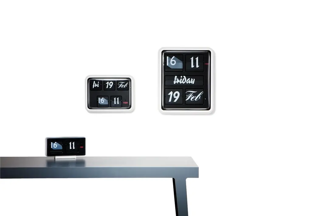 The iconic calendar clock, with its distinctive form and flip mechanism, has an established following in design circles. Sebastian Wrong deliberately increases our attraction to its retro look by introducing an ever-changing display. The Font Clock employs twelve different typefaces. These range from modern renditions of Classic type families like Bodoni to 20th century classics like Franklin Gothic and Helvetica. By working with the Grayson Time Management system, Established & Sons partners with the premier manufacturer responsible for providing the timekeeping for banks, post offices, schools and institutions such as the London Stock Exchange.