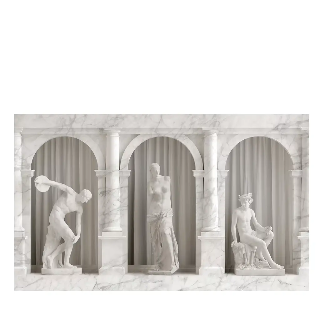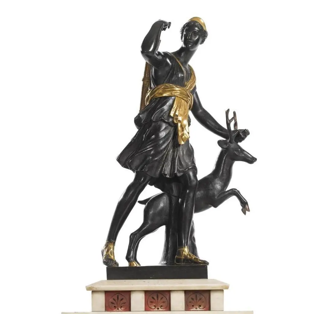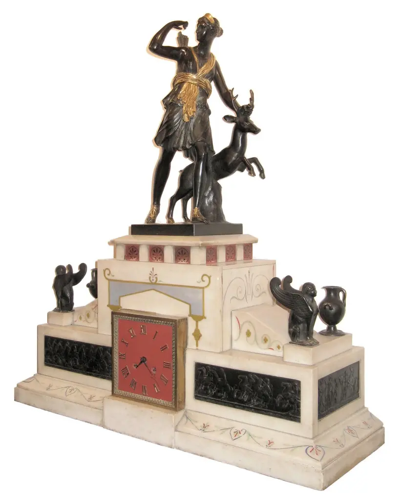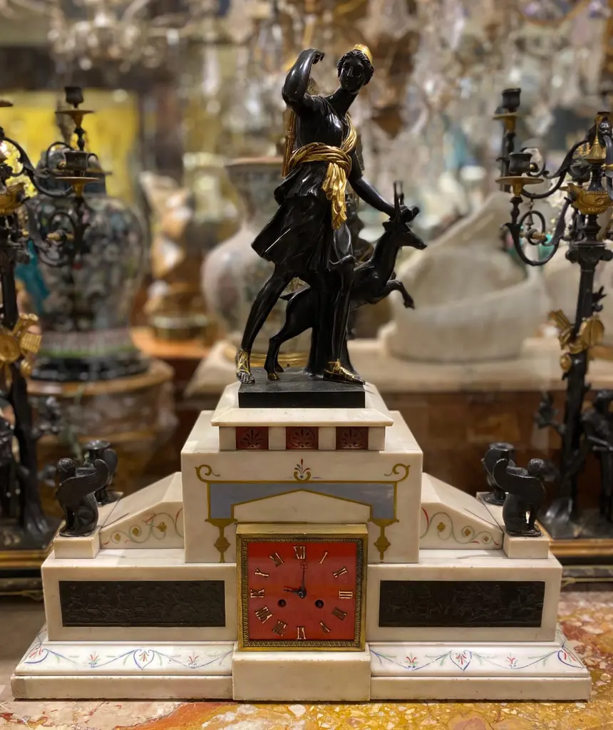 Large 19th century neoclassical figural patinated with gilt highlight bronze and marble mantle clock depicting Diana The Hunter.The marble is hand painted with classical decorations.