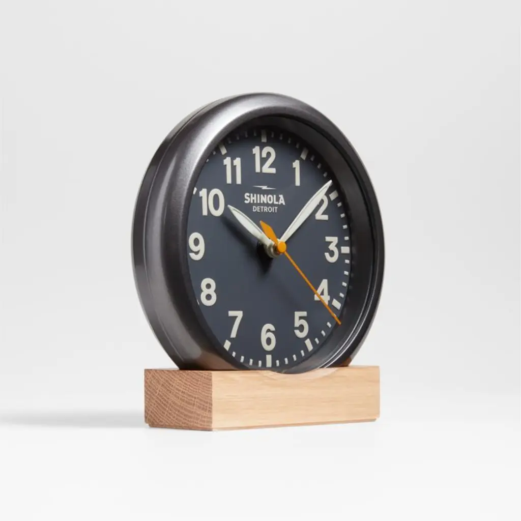 Luminous hands mark the passing of time on Shinola's Runwell desk clock in gunmetal grey. Built with a gleaming chrome casing, the round clock nests in a handsome oak stand. Cream numerals and graduations on the matte grey clock face keep the look crisp and timeless on your desk, while the orange second hand adds a sweep of color.Build it well or not at all. The clock is part of our exclusive collaboration with Detroit-based Shinola, an American brand (like us) committed to quality materials and great design. We're excited to partner with a brand that exhibits a strong work ethic and executes time-honored craft with a modern maker's spirit and Detroit style for days.