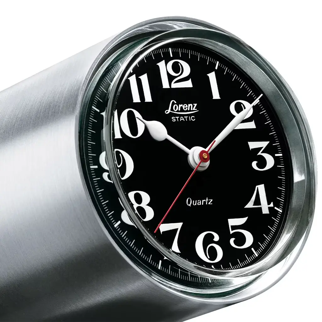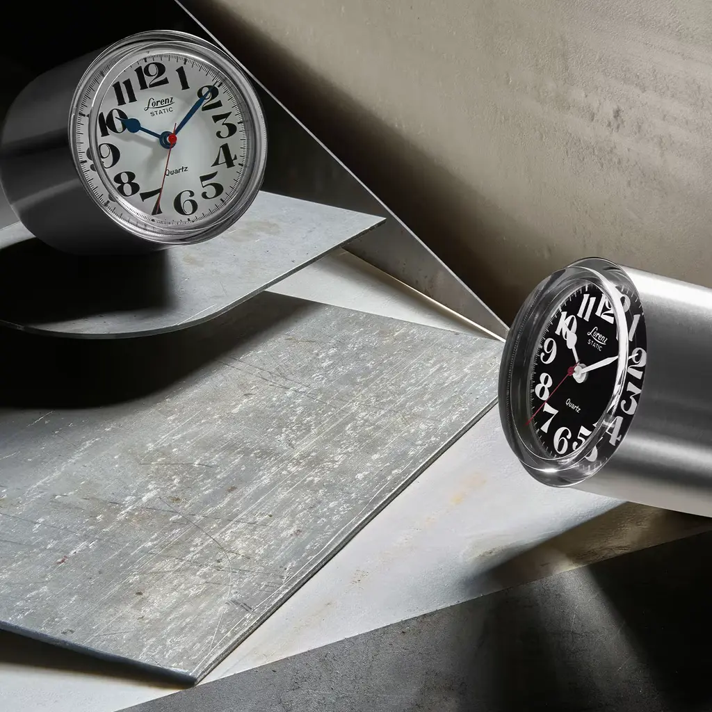 An icon of contemporary design, this table clock belongs to the new edition of the spectacular Static Table Clock designed by Richard Sapper, winner of the 1960 Compasso D'Oro Award. Available in different colors, it is handmade of satin steel and boasts the same innovative silhouette as the original design, resting obliquely on the tabletop facing upwards. Please consult the Artemest catalog for other available hues. Batteries are included.