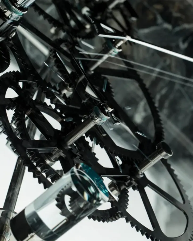 Adagio floor pendulum clock designed by Gianfranco Barban for Teckell is a part of Takto timepieces collection. The clear crystal glass structure of this elegant timepiece allows you to see the beautiful Graham escapement mechanism inside. The pendulum rod is made up of a metal alloy called Invar that has a low thermal expansion coefficient in the case of temperature variation. There is a stainless steel arbor which has a revolution of 15 ball bearings. The gears and pinions are DLC coated to reduce the friction coefficient. Graham Escapement is fixed at the top which responsible for maintaining the time. Around 6.5kg heavy stainless steel is used as pendulum bob. This fancy Adaigo clock has a charge autonomy of 7+1 days and power can be maintained up to 5 minutes. Base and top available in Marquina black, brushed silver wave gray, or polished Covelano white.Indoor use only.DIMENSIONSL 29.92" W 12.99" H 88.58''L 76 cm W 33 cm H 225 cmLEADTIME: Most Teckell products are made-to-order with a lead time of 4-6 weeks ex-factory; selected products may however be in stock. Please inquire with us for details.