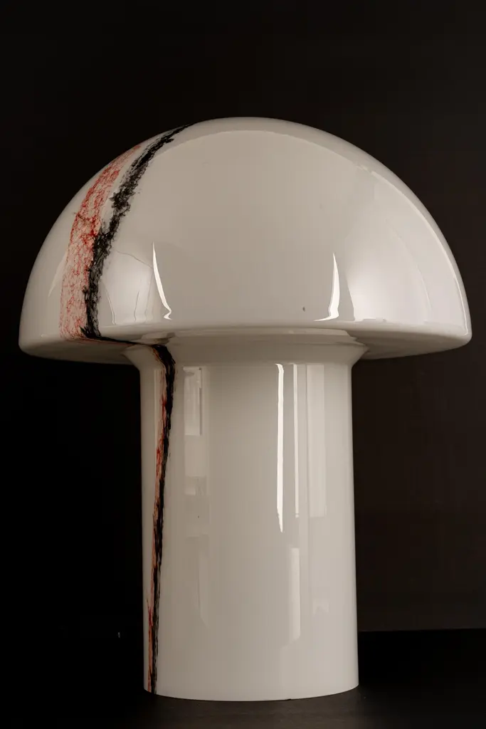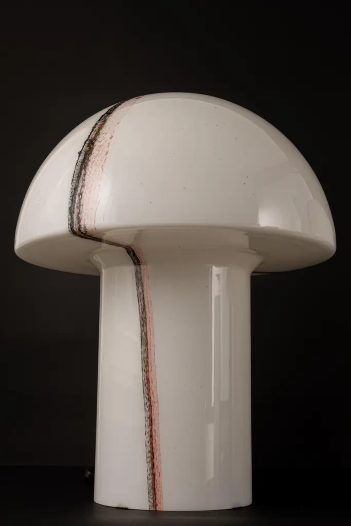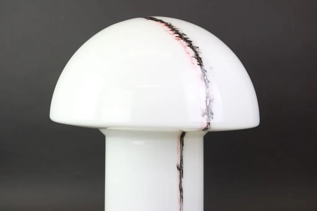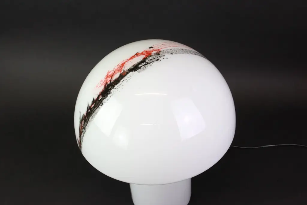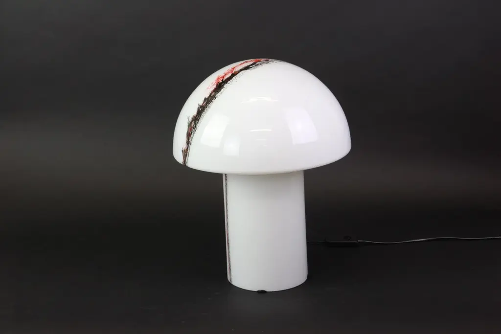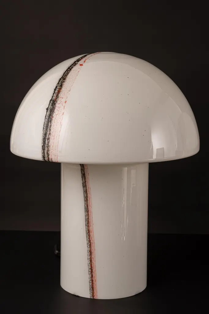 1 of 2 Wonderful extra-large midcentury mushroom table lamp by Peill & Putzler, Germany, 1970s.Made of a single piece of blown and cased glass with black and red pigment inclusions which have been applied in an abstract expressionist manner.This gestural streak of color encompasses the entire glass body and its edgy quality contrasts nicely with the smooth surface and shape of the mushroom shape.Manufacturer: Peill & PutzlerStunning glass form and color-heavy quality and in very good condition. Cleaned, well-wired, and ready to use. Each Table lamp requires one E27 Standard bulb with 100W max.Light bulbs are not included. It is possible to install this fixture in all countries (US, UK, Europe, Asia, Australia.)Dimensions:Diameter: 17.6" / 45cmHeight: 21.6" / 55cm Fully functional.The listed price is for one item.Three Items are available.