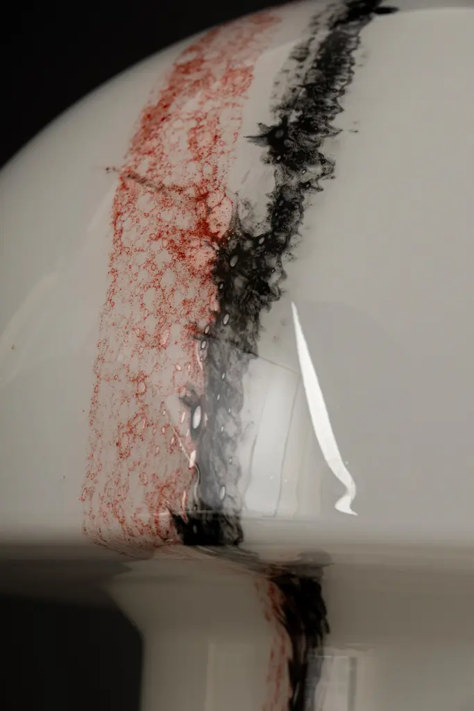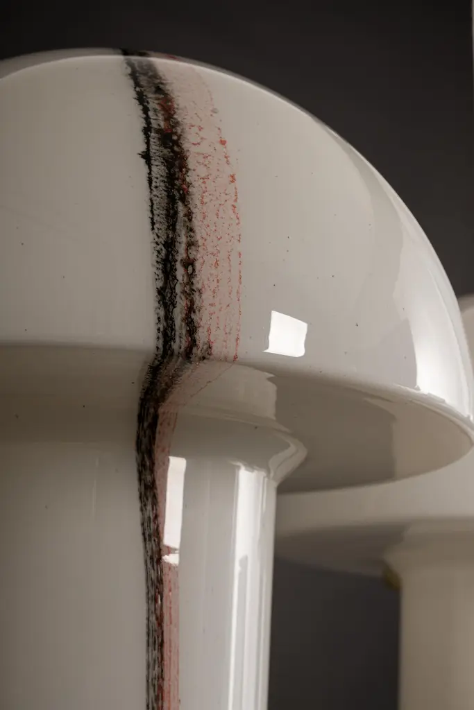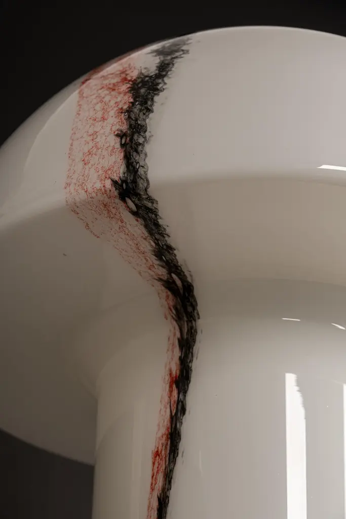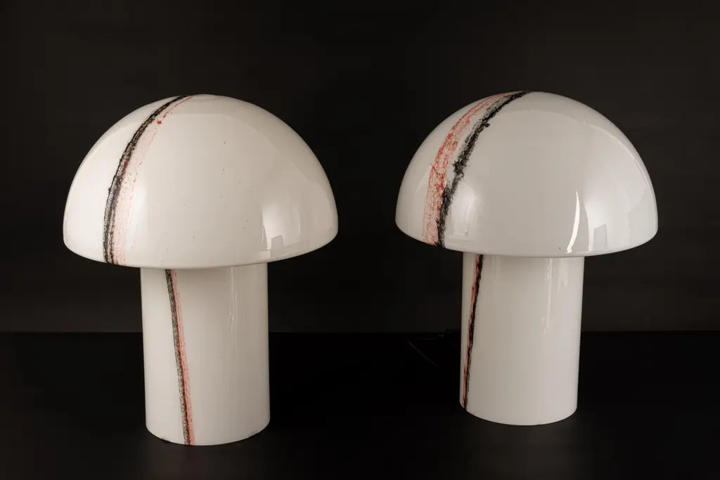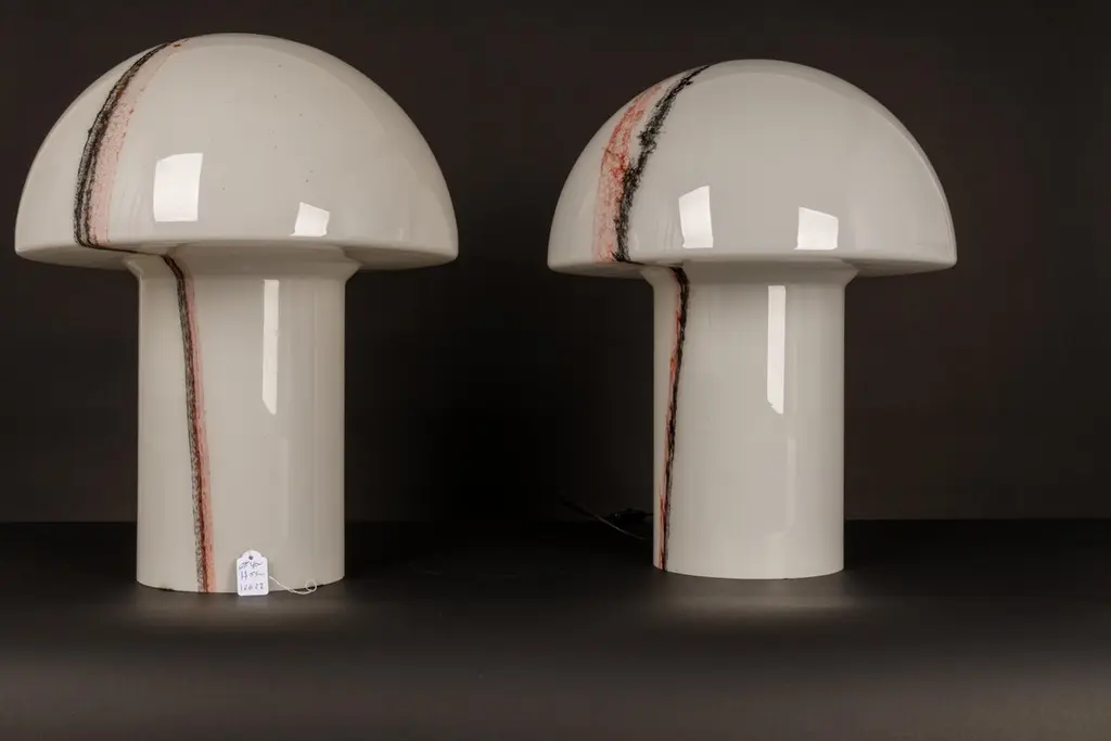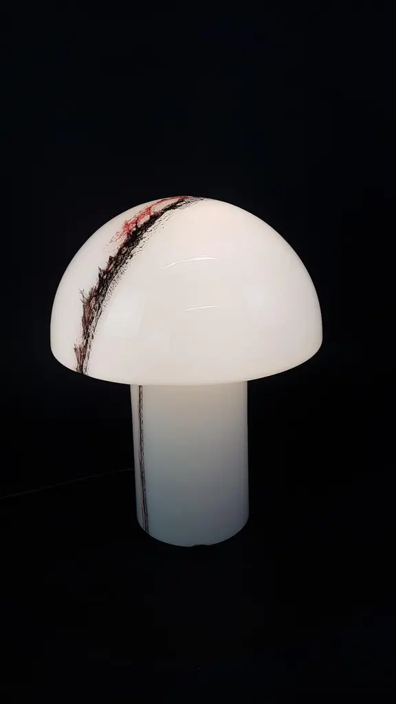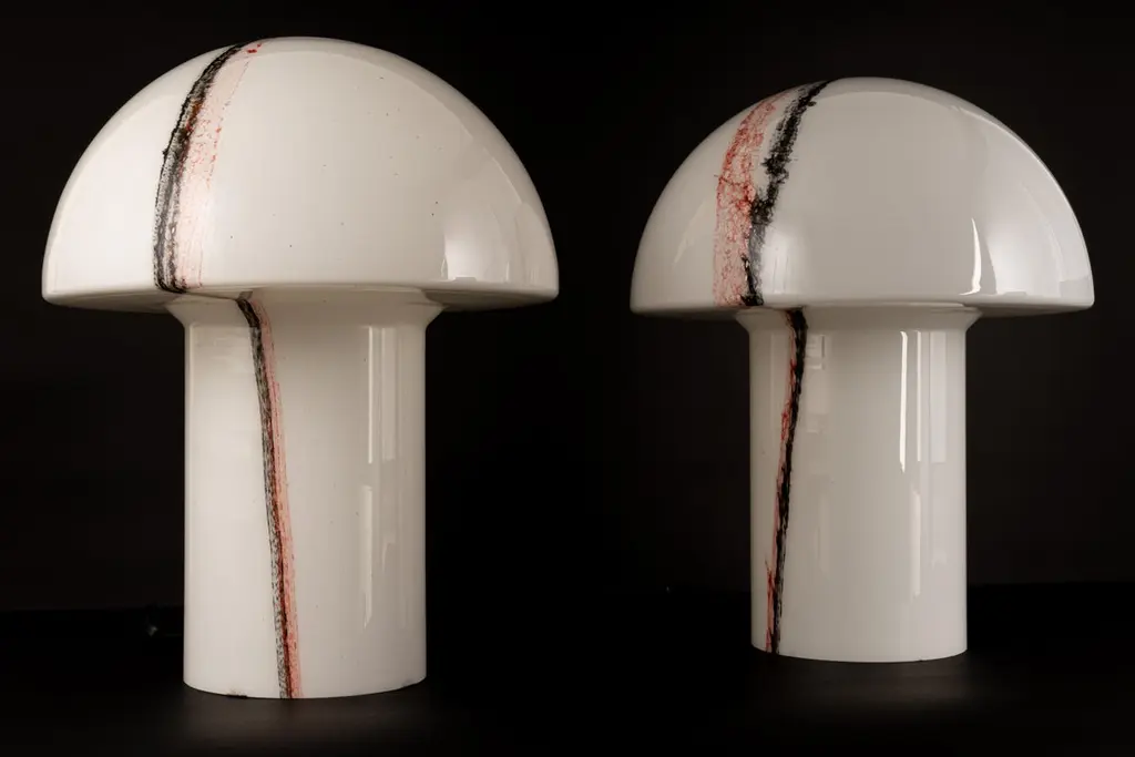1 of 2 Wonderful extra-large midcentury mushroom table lamp by Peill & Putzler, Germany, 1970s.Made of a single piece of blown and cased glass with black and red pigment inclusions which have been applied in an abstract expressionist manner.This gestural streak of color encompasses the entire glass body and its edgy quality contrasts nicely with the smooth surface and shape of the mushroom shape.Manufacturer: Peill & PutzlerStunning glass form and color-heavy quality and in very good condition. Cleaned, well-wired, and ready to use. Each Table lamp requires one E27 Standard bulb with 100W max.Light bulbs are not included. It is possible to install this fixture in all countries (US, UK, Europe, Asia, Australia.)Dimensions:Diameter: 17.6" / 45cmHeight: 21.6" / 55cm Fully functional.The listed price is for one item.Three Items are available.