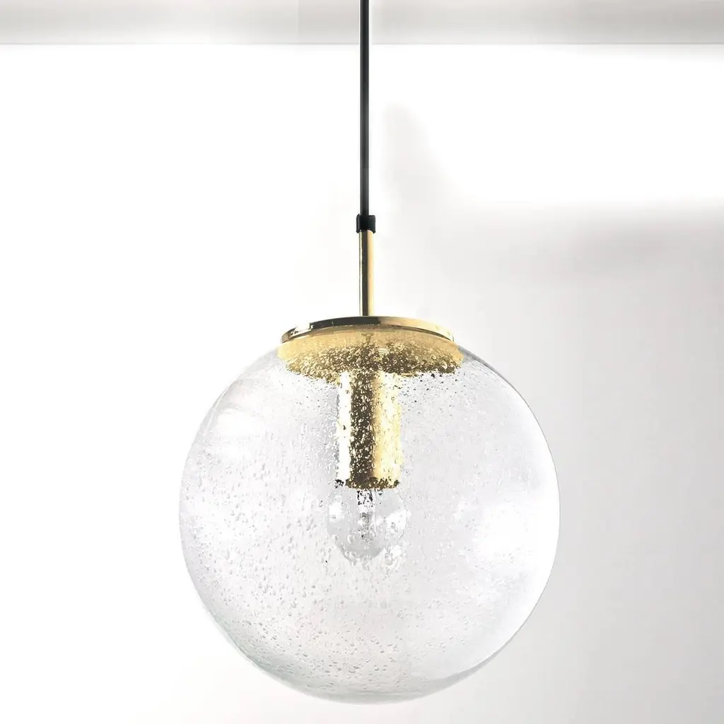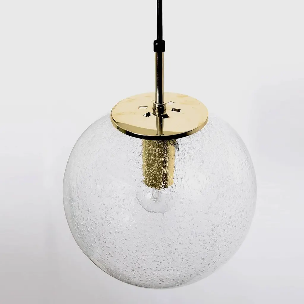 1 of 4 absolutely amazing huge ceiling mount pendant light fixtures with five globes or spheres by Limburg Glashütte. With handblown glass pendants. Complete with a special new custom-made ceiling plate for five globes. Very suitable for building beautiful compositions. A rare opportunity which you don’t see often.The handblown glass has small air bubbles in it, what gives a nice diffuse light effect and a nice pattern on ceiling, walls and floor. The messing parts are nicely shaped and the inside has a mirror for dispersing the light. This all makes the lamp stand off other glass globe lamps. This lamp is can be used for a room, a stunning staircase, or to decorate a corner of your home. The cables can be adjusted per globe to alter the height required. Also possible for higher sealing.They will be sold singly, as pair or set of three. Diameter of the globes: 9.8"(25 cm). Diameter of the ceiling cup: 15.7 "(40 cm). Height: Body includes cable and ceiling cup: 51.1" (130 cm). Newly rewired in a black fabric / textile / cloth covered cable. We can supply, free of charge, any length and color/ color of cable to meet your exact requirements.