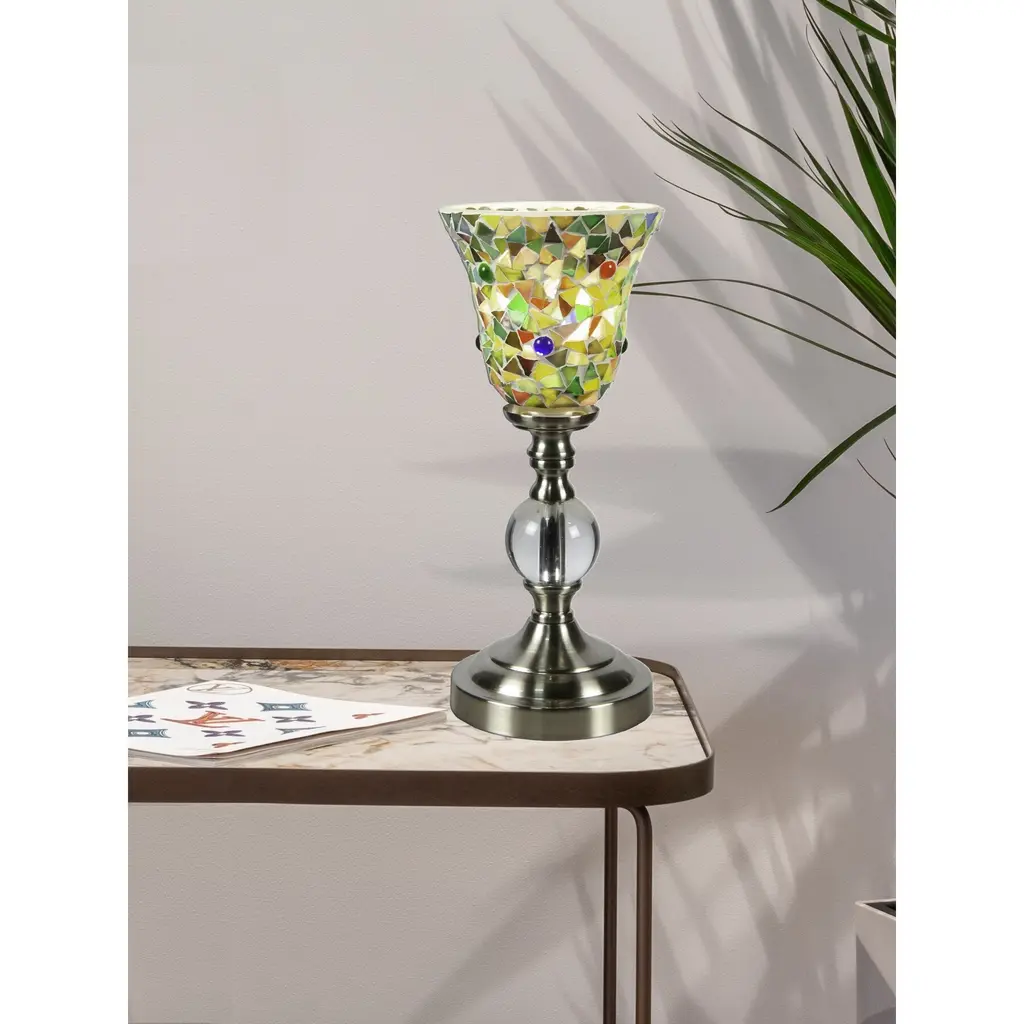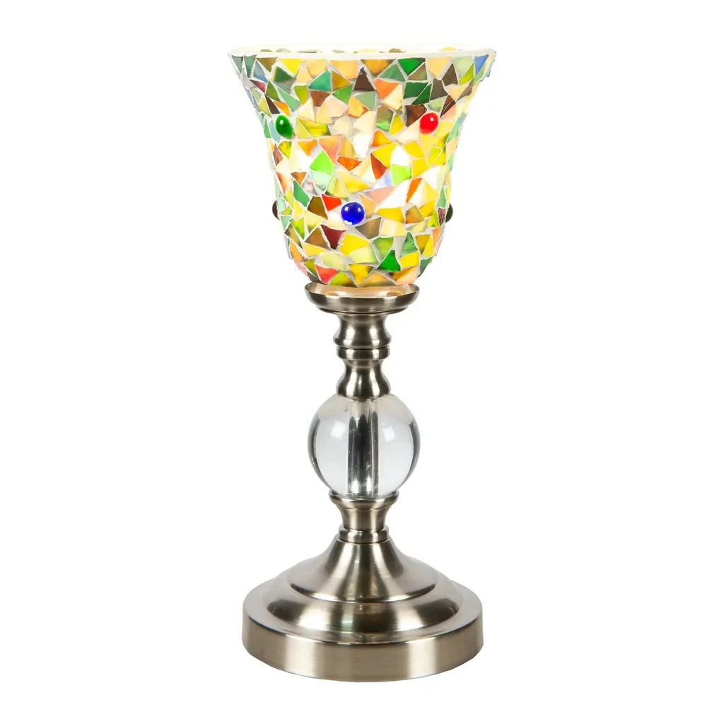 Dale Tiffany Lucida Mosaic Accent Lamp: This accent lamp dazzles with a vibrant mosaic of green, yellow, and red, adorned with glass beads in rich shades of red, green, and blue, all elegantly set upon a sleek silver-finished metal base, crowned with a radiant crystal glass ball, encapsulating artistry and elegance in one.