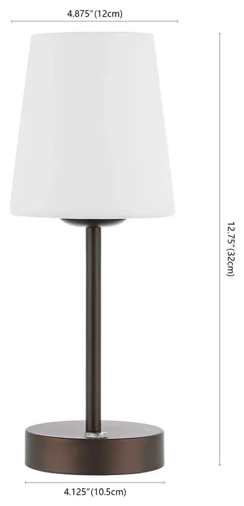 Add modern flair to your bar or vanity with our tailored glass and metal accent lamp. This cordless, rechargeable mini lamp is the perfect modern accent for your dining room, living room, bedroom, or entry. A single LED bulb in a frosted glass globe provides plenty of light. Clean lines and a high-quality finish add a glam touch.Features:• This cordless lamp is a minimalist modern accent with a frosted shade and a classic aged-bronze finish• Cordless, portable lamp has a rechargeable battery for convenient accent lighting on a bar, console, or vanity• The frosted glass shade and LED bulb work together to produce warm ambient lighting• Integrated 2.5W LED bulb• Color: Oil Rubbed Bronze with white shade• Body Material: Metal• Includes: One (1) lamp• Assembly RequiredDimensions:• Lamp: 12.75 inches high x 4.875 inches wide x 4.875 inches deepAbout us:You see a lamp.We see a decorative work of art.A perfectly curved shade casts a dramatic shadow on a floor. A silk cord you never want to hide. Compatible with LED lightbulbs: as easy on the environment as they are on the eyes. The JONATHAN Y Lighting collection considers every detail from impeccably sourced materials to designer styling. And our prices are so attractive, we''ve transformed a functional necessity into a fashion accessory.JONATHAN Y Lighting - a fashion revolution in home decor.