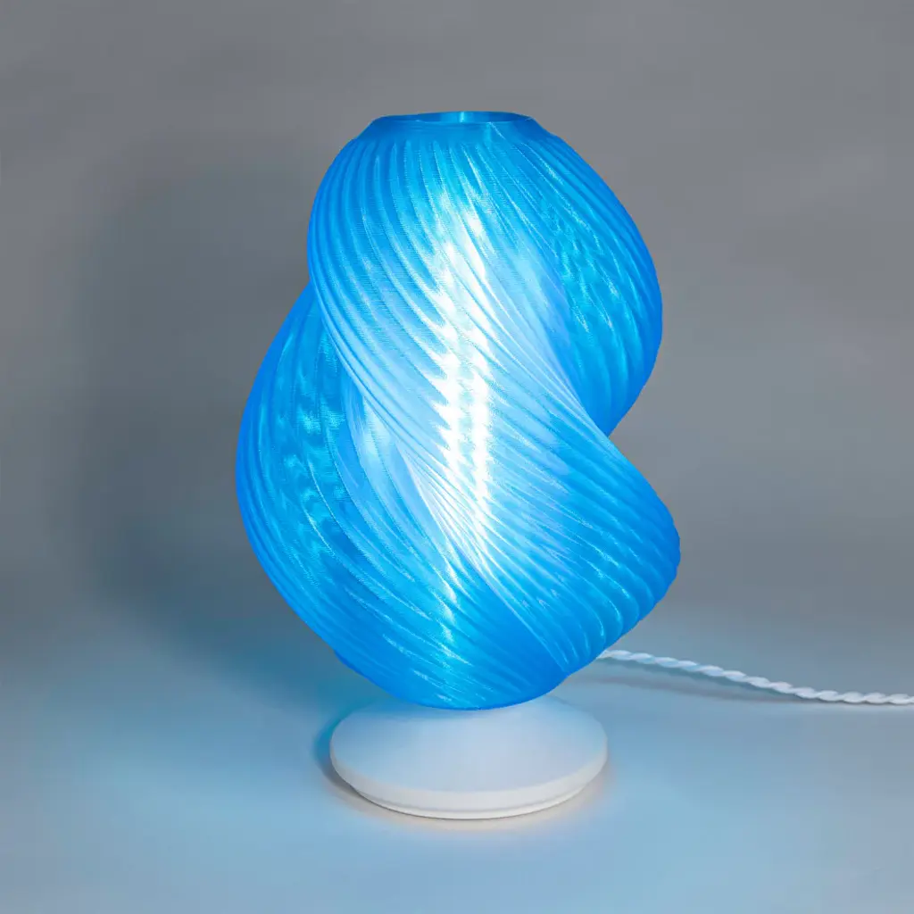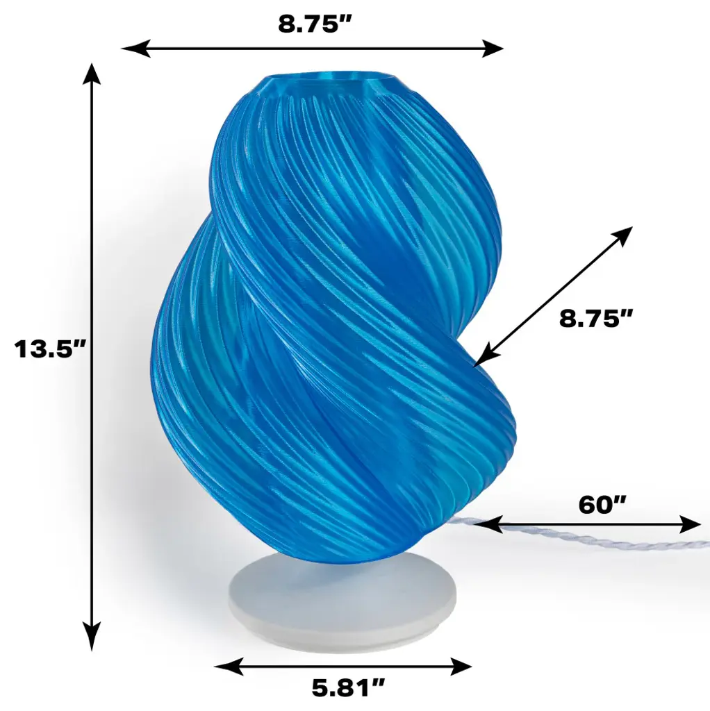 Hand-blown Murano glass-inspired the swirling form of our contemporary accent lamp. The glowing 3D-printed design is made of eco-friendly material, and includes a built-in dimmer switch. Whether you need bright illumination or a night light, this lamp is ideal for a mid-century living room, dining room or bedroom.-Glass-look blue plastic shade on a white base-Quality touches include a braided silk-wrapped cord with an in-line switch and dimmable LED bulb-At just under 14" tall, this lamp adds ambient lighting to any modern space-Eco-friendly 6W LED bulb included-Incandescent bulbs are not safe for 3D printed lamps-Color Temperature: 2700K-CRI: >80-Color: Clear Blue Body with White Base-Body Material: PLA Filament-Base Material: PLA Filament----Includes: One (1) lamp-Assembly Required-Lamp: 13.5 inches high x 8.75 inches wide x 8.75 inches deep-Shade: 10.94 inches high x 3 inches wide x 3 inches deepYou see a lamp.We see a decorative work of art.A perfectly curved shade casts a dramatic shadow on a floor. A silk cord you never want to hide. Compatible with LED lightbulbs: as easy on the environment as they are on the eyes. The JONATHAN Y Lighting collection considers every detail from impeccably sourced materials to designer styling. And our prices are so attractive, weeve transformed a functional necessity into a fashion accessory.JONATHAN Y Lighting - a fashion revolution in home decor.