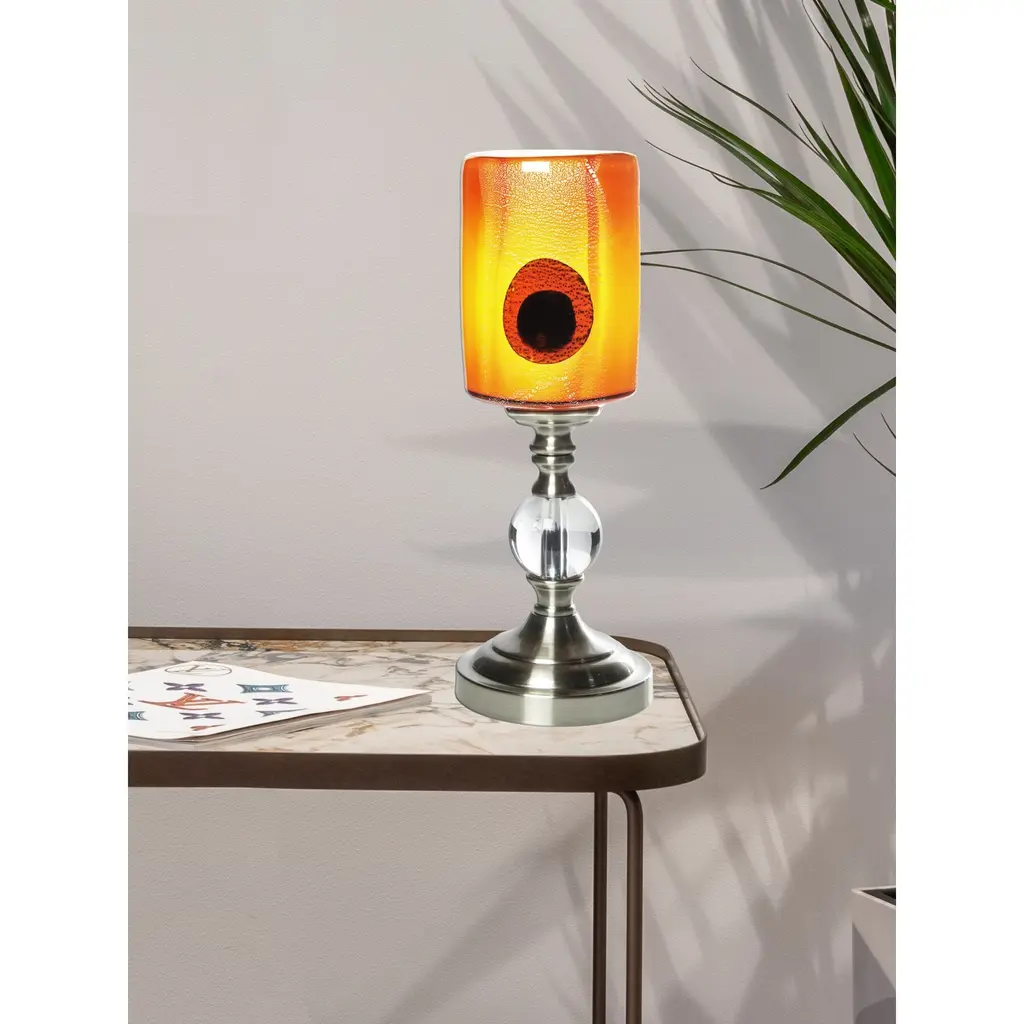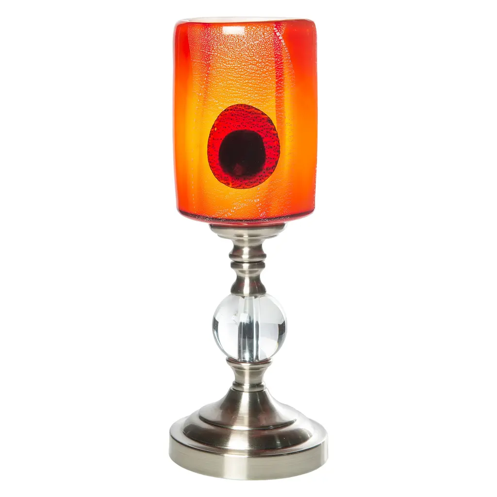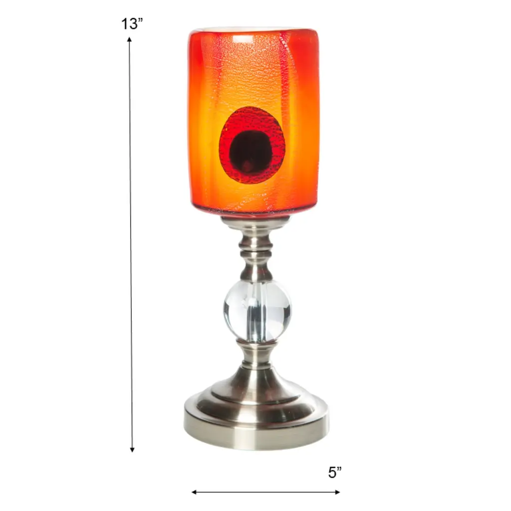 Dale Tiffany Filare Accent Lamp: This accent lamp channels the dynamic essence of a flame torch with its vibrant red and orange hues, anchored by a sleek silver-finished metal base and accentuated with a sparkling crystal ball, creating a bold statement of passion and sophistication.