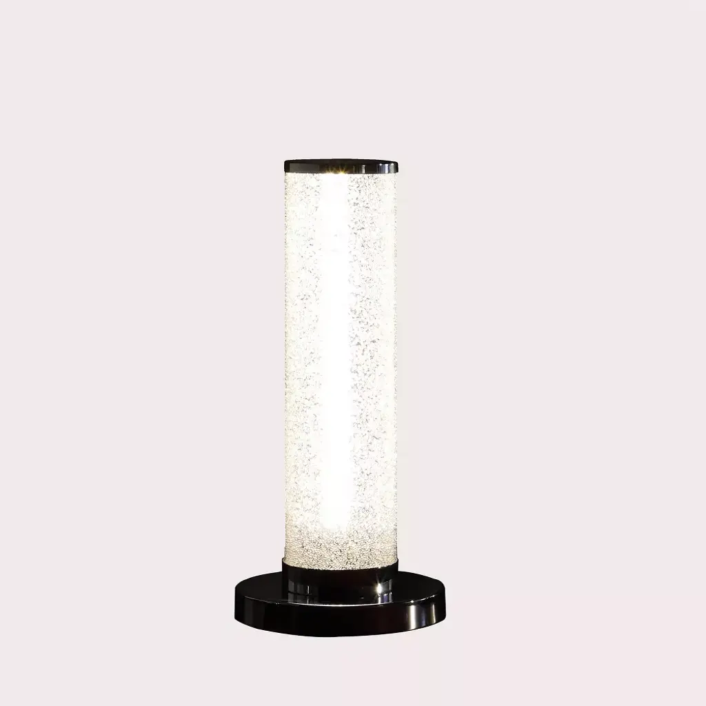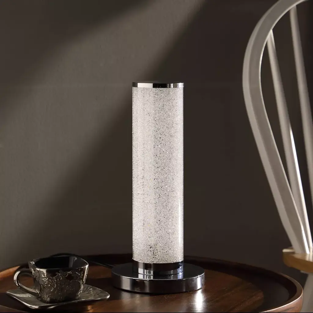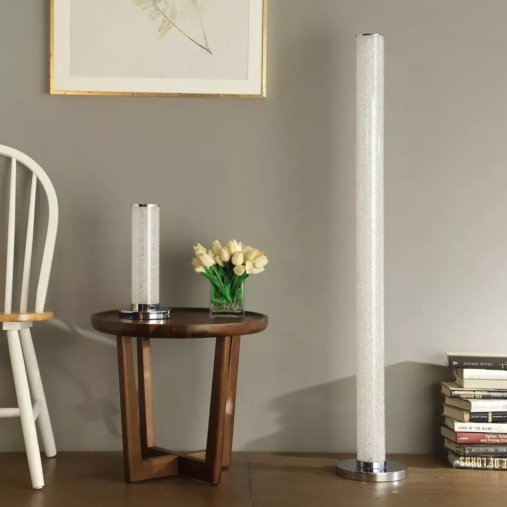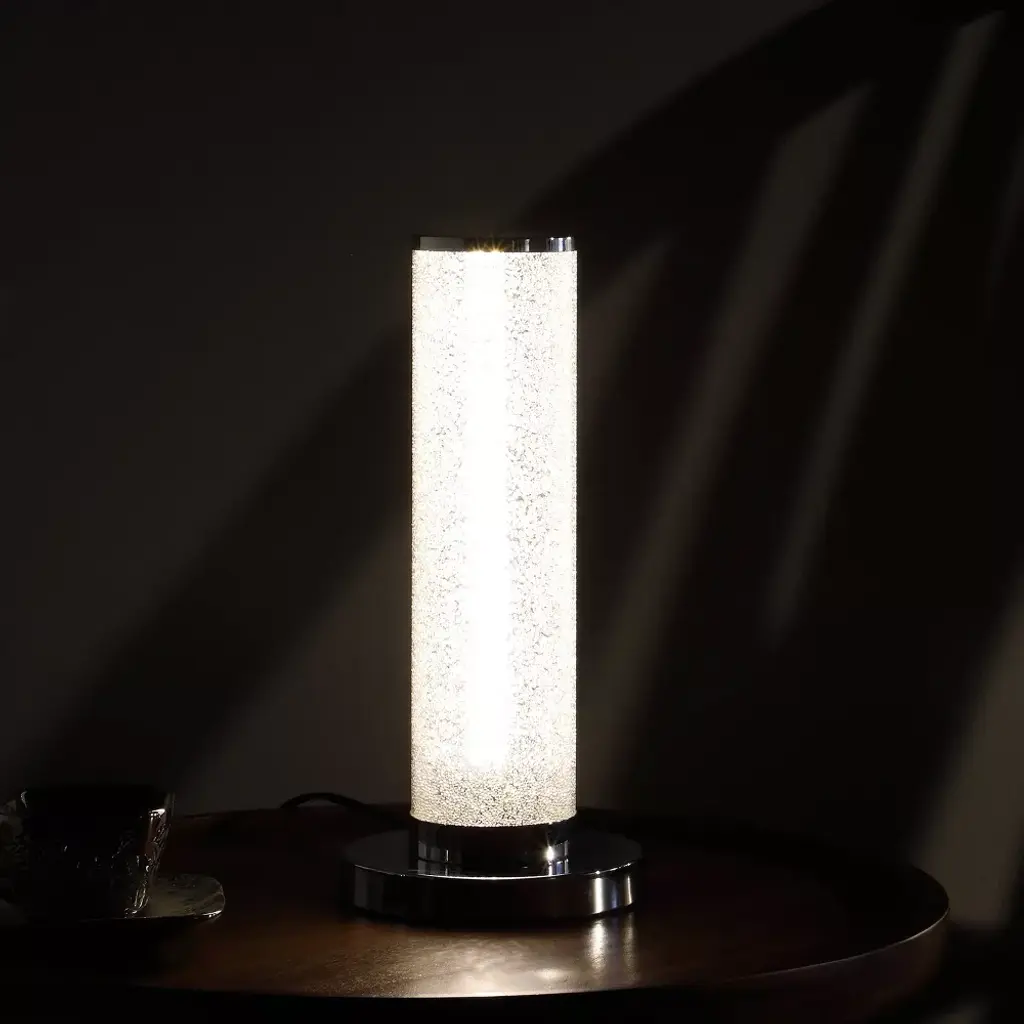 Dynamic lighting designs to accentuate and compliment any space. From conceptualization to reality, Illuminari White Crystal Sandrocks Column Table Lamp features a shiny Chrome steel base. PET polyester tube diffuser. Provides both direct and indirect light from one LED tower light source. Clear tube is filled with hundreds of white crystal sandrocks surrounding white LEDs, as the lights slowly phase, the sandrocks catch and refract the light for a dazzling effect. When a room calls for understated modernism, this table lamp answers with the perfect balance of minimalism and statement-making design. The energy-efficient integrated built-in LEDs cast a bright glow from the slim line bar base. Eco-friendly fixture for your home. Serve as great sources of light but is more than attractive enough to be classed as an ornament and could certainly rival the aesthetic appeal of any sculpture you may have on display.