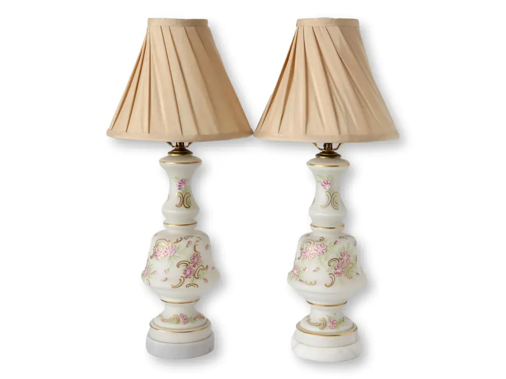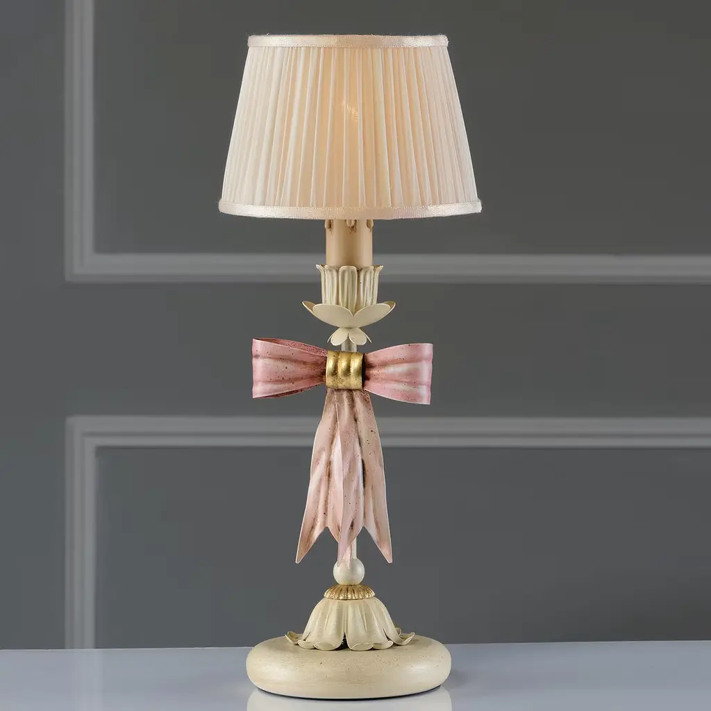This elegant light table lamp will add a touch of charm to any space in need of some extra lighting. This metal lamp has been hand-decorated with gold-leaf detailing, has a perky pink metal bow tied around the middle of the body, and an ivory-colored organza lampshade. \nLight bulb: E14.