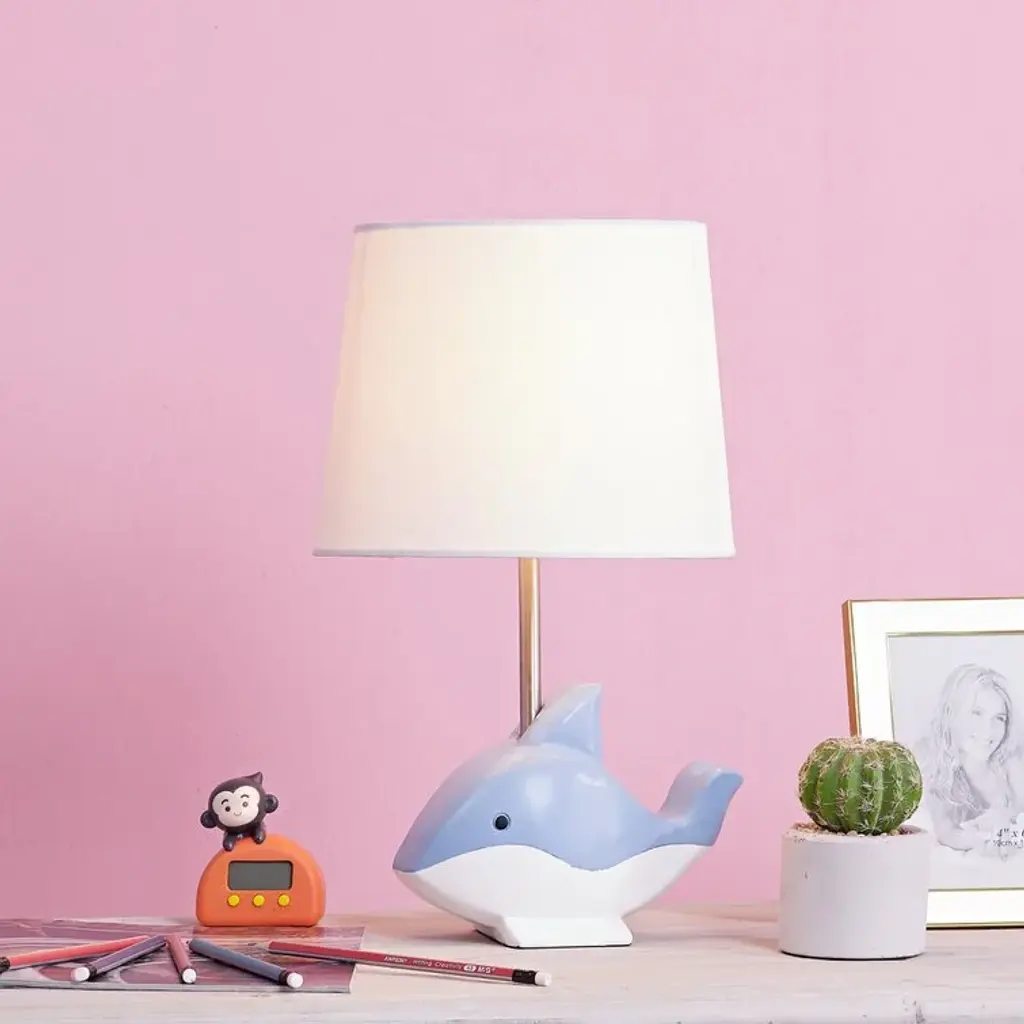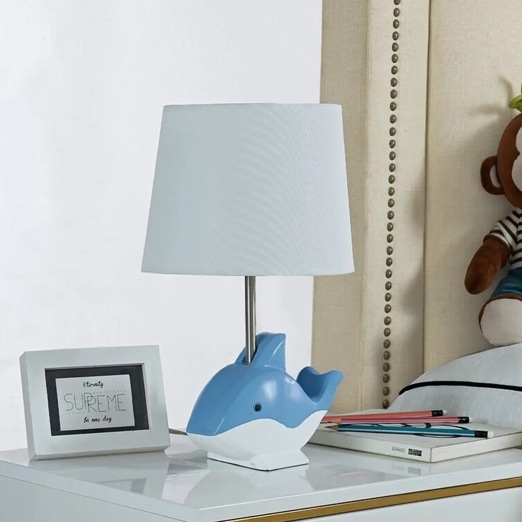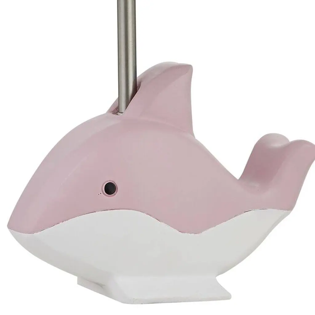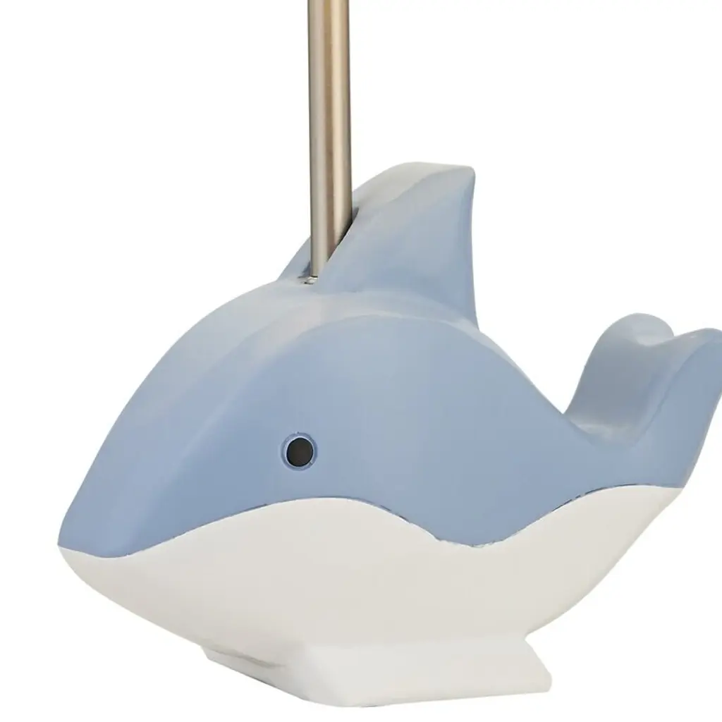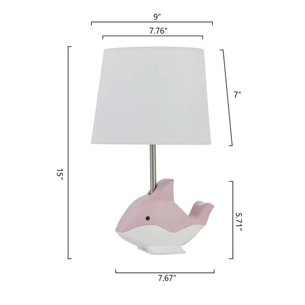 This 15" table lamp is just the right addition to your little one's bedroom or playroom. It features a cute dolphin design on the base for a fun and coastal feel in your space. This lamp is made with a resin base in a cream hue, and it has a sleek, chrome-finished body. On the top, it has a white fabric Empire drum shade that diffuses the light from a single 40W bulb, which is sold separately. Plus, this lamp has a small footprint, so it won't take up too much surface space on a nightstand or bureau. Product Details: