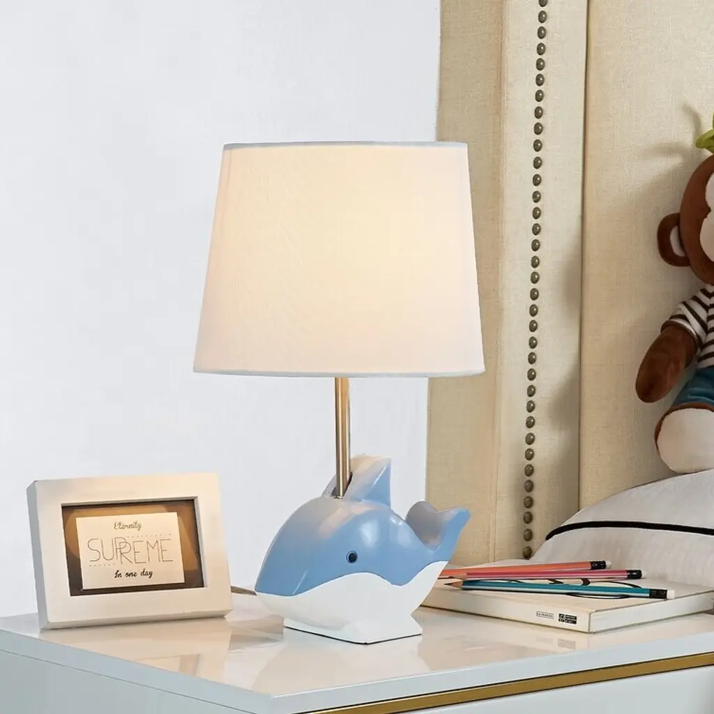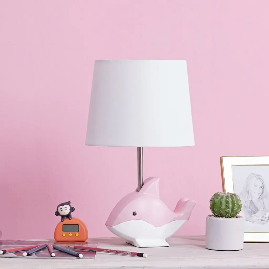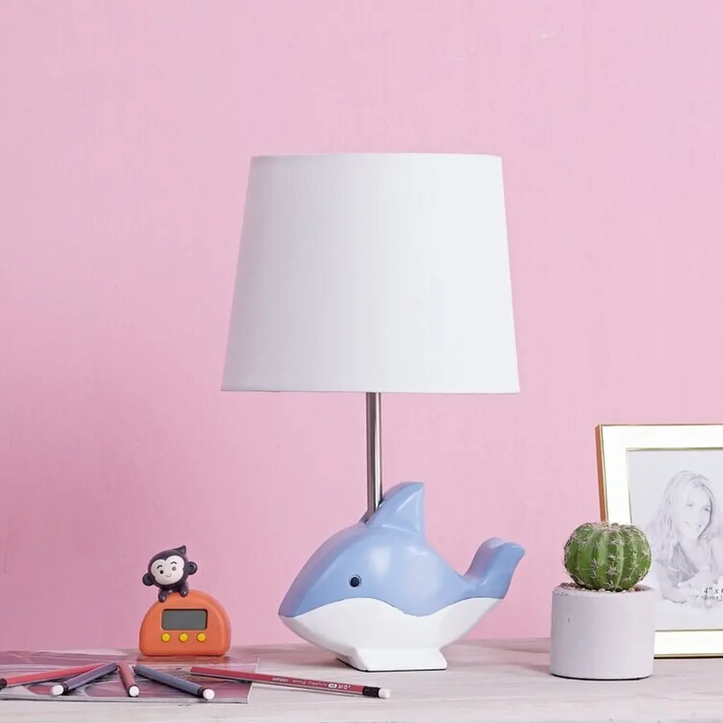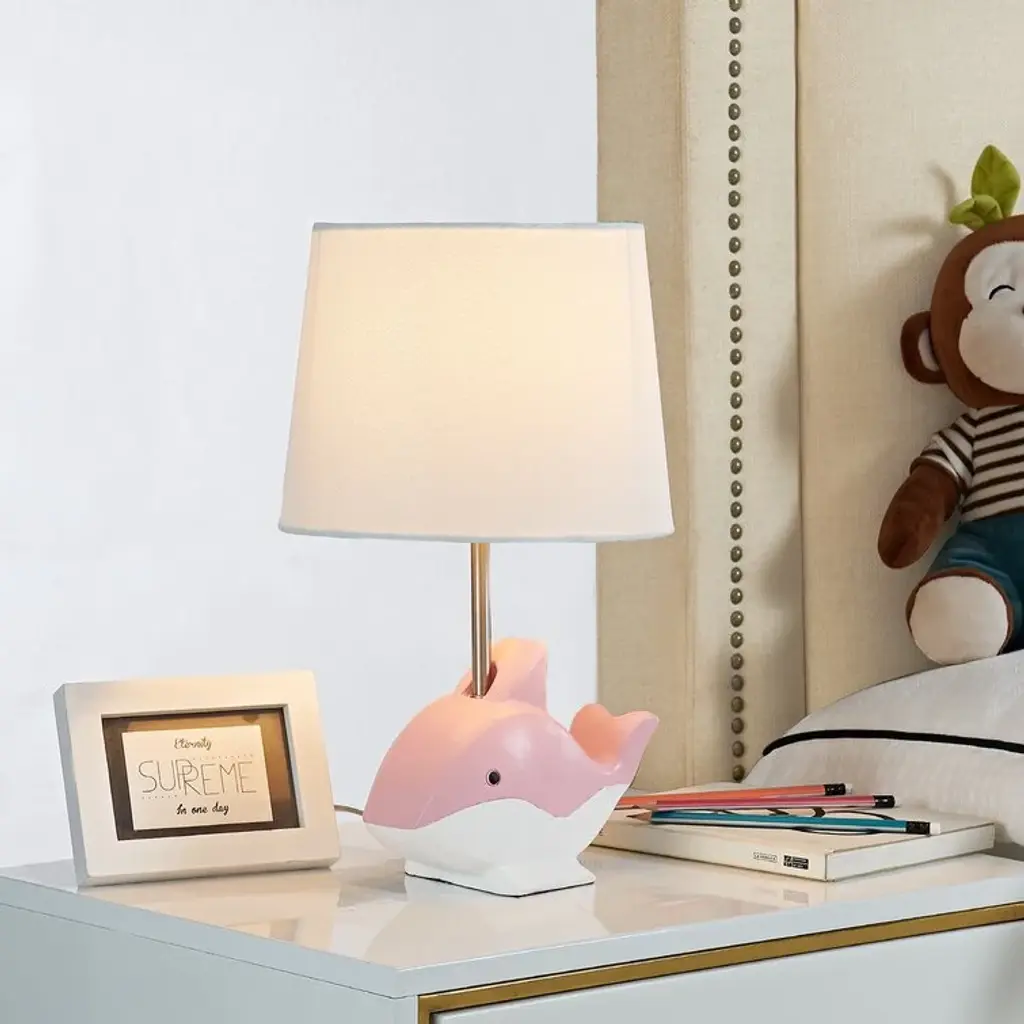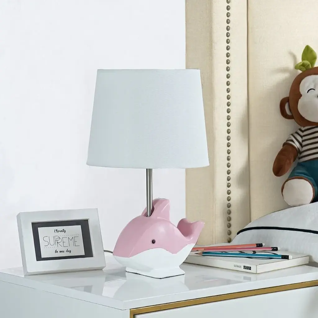 This 15" table lamp is just the right addition to your little one's bedroom or playroom. It features a cute dolphin design on the base for a fun and coastal feel in your space. This lamp is made with a resin base in a cream hue, and it has a sleek, chrome-finished body. On the top, it has a white fabric Empire drum shade that diffuses the light from a single 40W bulb, which is sold separately. Plus, this lamp has a small footprint, so it won't take up too much surface space on a nightstand or bureau. Product Details: