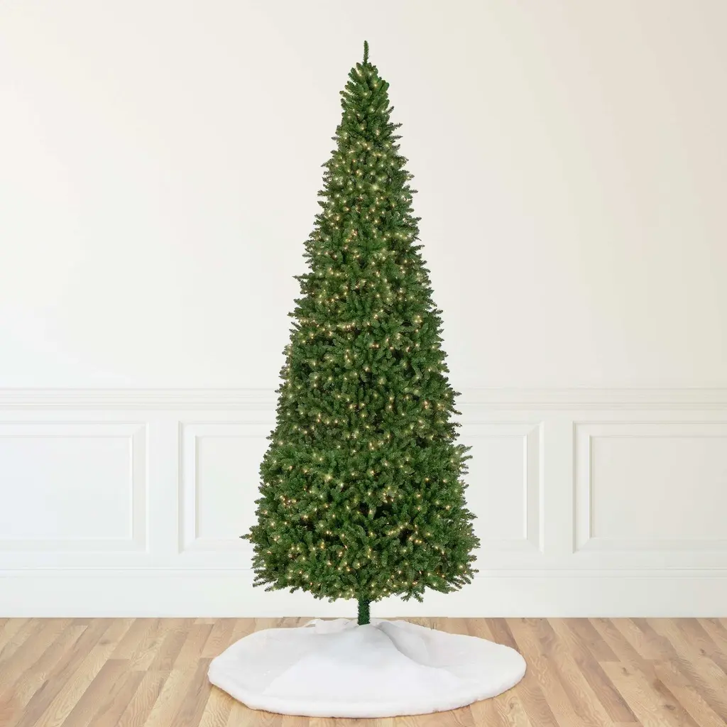 Though tall in stature our 15-foot Genoa Fraser Fir offers a slender profile making it ideal for those with limited space. Whether you are looking for an entryway tree or to fill a hallway or small corner this slim silhouette artificial Christmas tree is a lovely choice. The natural green foliage mixed with the soft glow from the incandescent lights creates a timeless look that will be cherished for many years to come. Product features: Pre-lit with 1800 clear lights Bulb size: mini Bulb type: incandescent 7091 branch tips 1.5" wide tapered tips 72" green lead cord 7-piece easy assembly (including stand) Slim profile tree Additional product features: Hinged branch construction UL certified and approved for indoor use only If one bulb burns out the rest will stay lit Lights are equipped with Lamp Lock feature which makes them replaceable interchangeable and keep them from falling out Comes with replacement bulbs and spare fuses Includes a sturdy metal tree stand Wire gauge: 22 120 volts 60 hertz Dimensions: 15' high (from the base of the stand to the top of the tree) 74" base diameter (at the widest point) Material(s): PVC/metal/glass bulbs/wire Note: Branches are compressed for shipment and need to be fluffed out upon arrival to look like the photo.