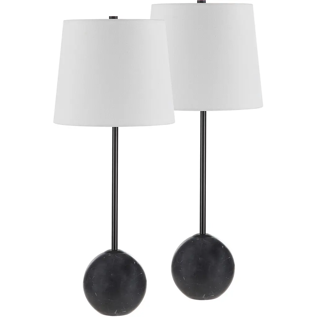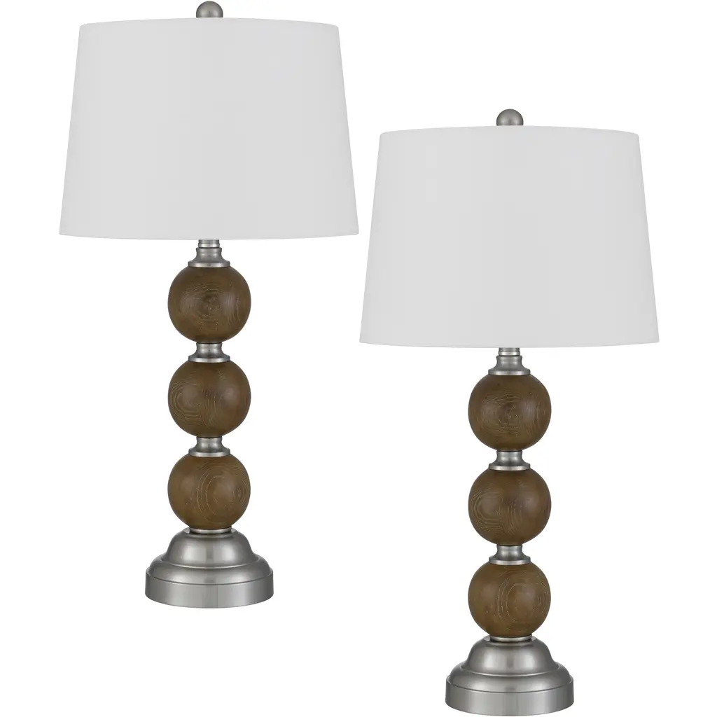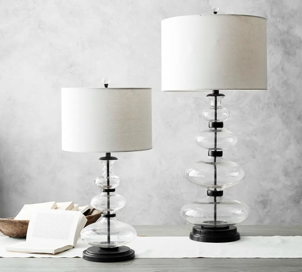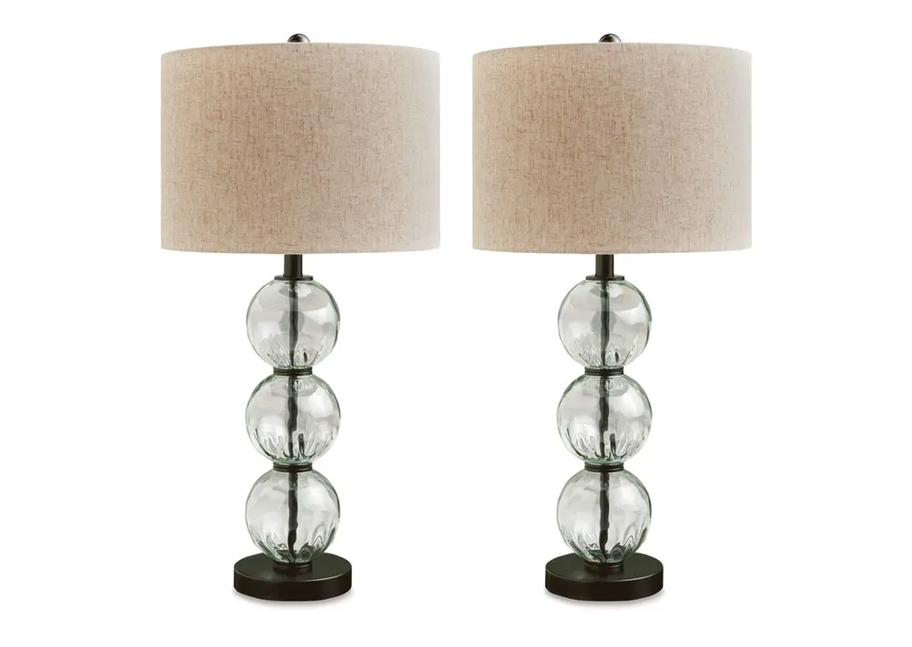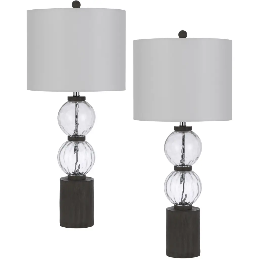 The Mystic table lamps are constructed with textured glass and have stunning dark oak finish color. These lamps are sold in pairs and provide 150 watts of efficient lighting. It also features twp shades and a stacked glass orb design.