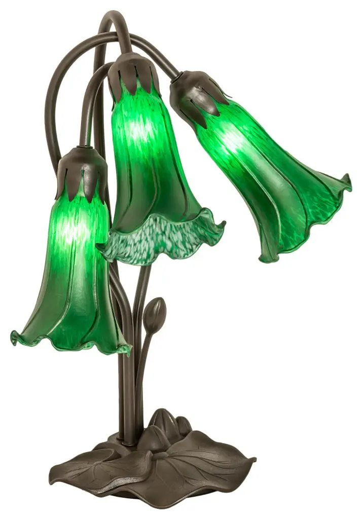 Inspired by Tiffany''s famous Pond Lily design from the early 1900s... This table lamp is created with three mouth blown shades featuring Amber art glass. The Pond Lily shades are embraced by an elegant Cast Metal Base featuring a Mahogany Bronze finish. The Pond Lily Table Lamp is featured in our American designed; handcrafted Favrile Style Lighting Collection. UL and cUL listed for dry locations. Each shade is a unique work of art with color variations based on natural ingredients inherent in the glass. Contact us if color matching is critical when ordering multiple items.