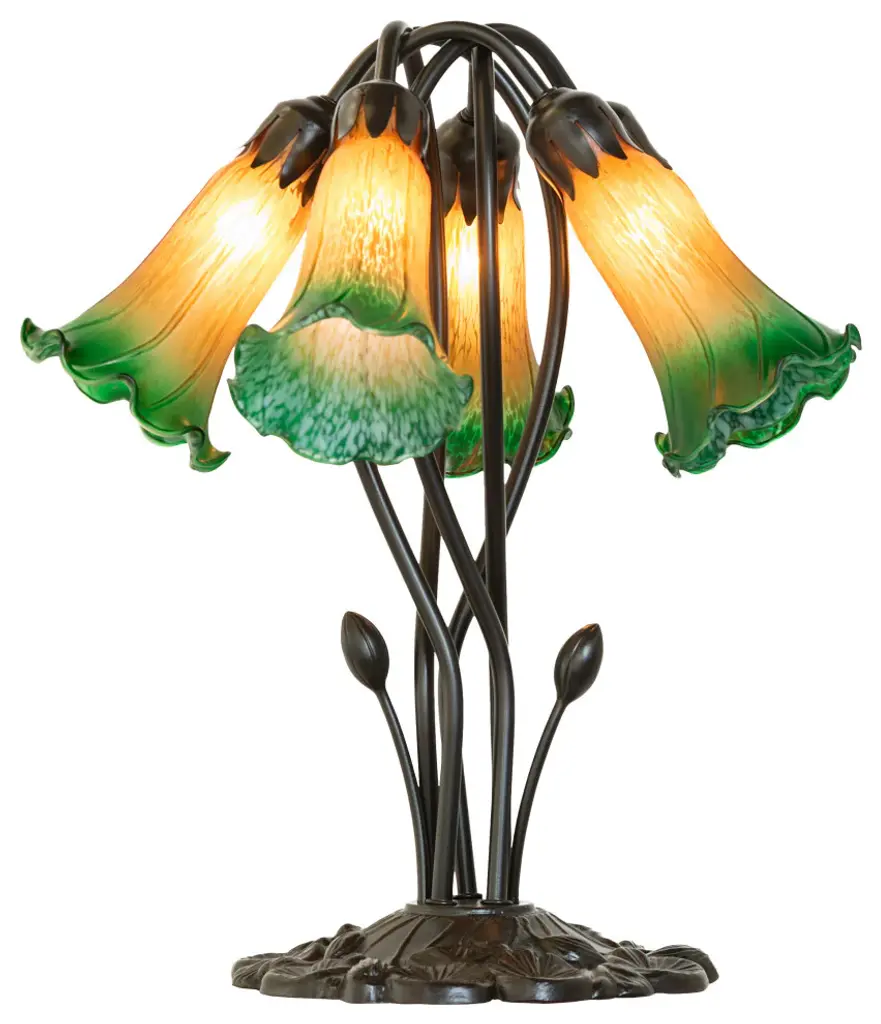 Recreating the famous Tiffany design from the early 1900s. This elegant table lamp features five Amber/Purple Favrile-style art glass shades. An elegant cast metal base and arms embrace the Lily shades with floral-style fitters finished by hand in Mahogany Bronze and inspired by antique lighting in homes from the Bowery in New York City; to Philadelphia; Pennsylvania; to San Francisco; California. The lamp is ideal for placement on an occasional table or credenza in a fine home or hotel. The Tiffany Pond Lily 5 Light Table Lamp is included in our American-designed; handcrafted Favrile Glass Lighting Collection. UL and cUL listed for dry locations. Each shade is a unique work of art with color variations based on natural ingredients inherent in the glass.