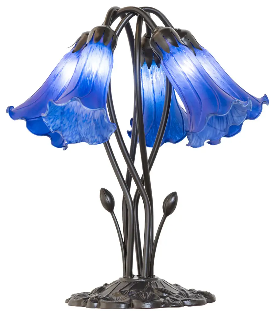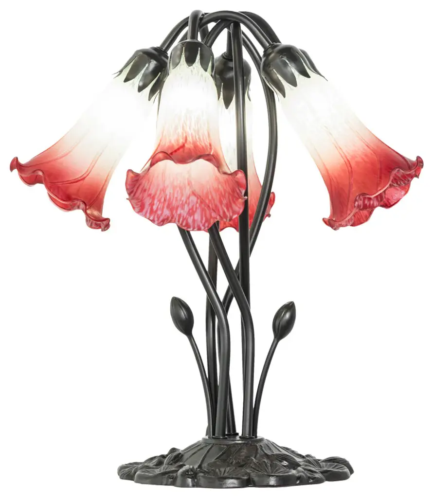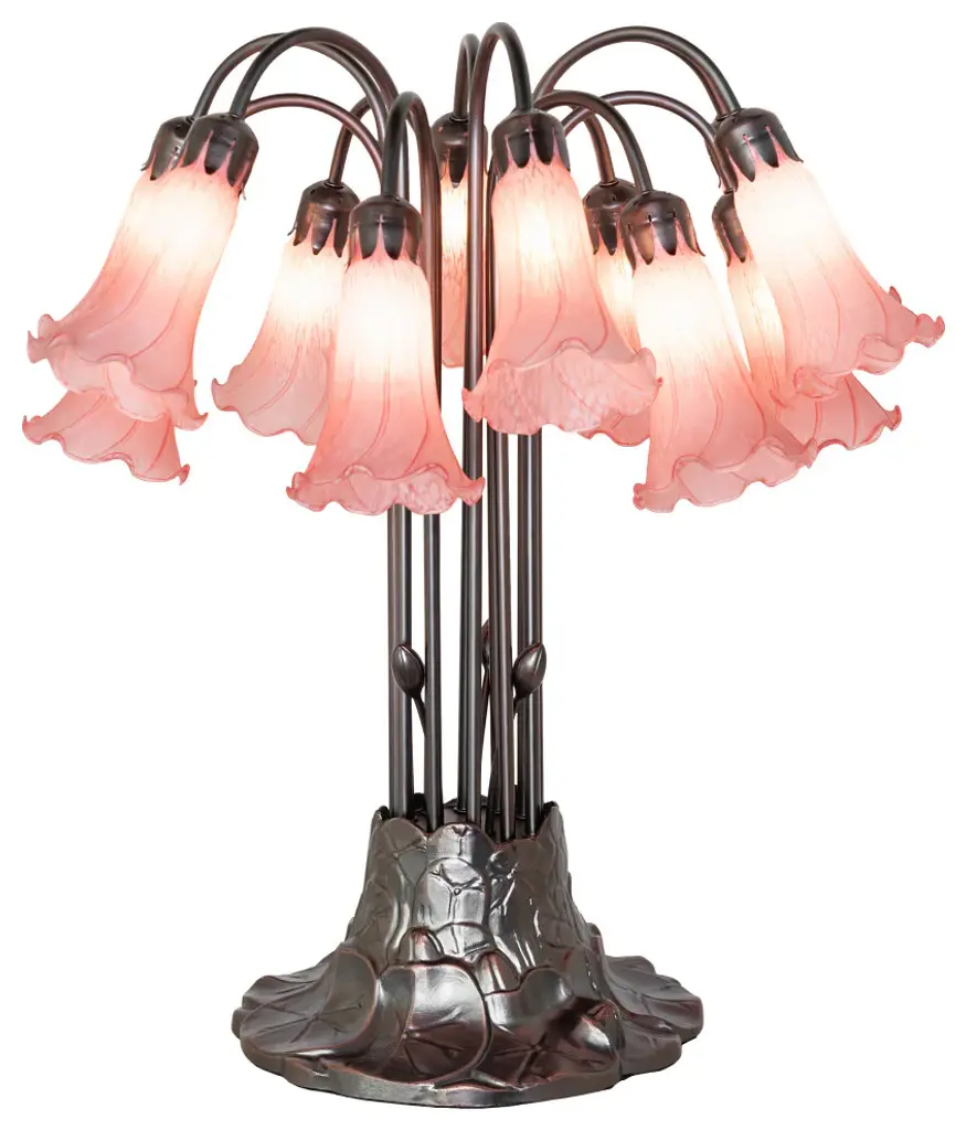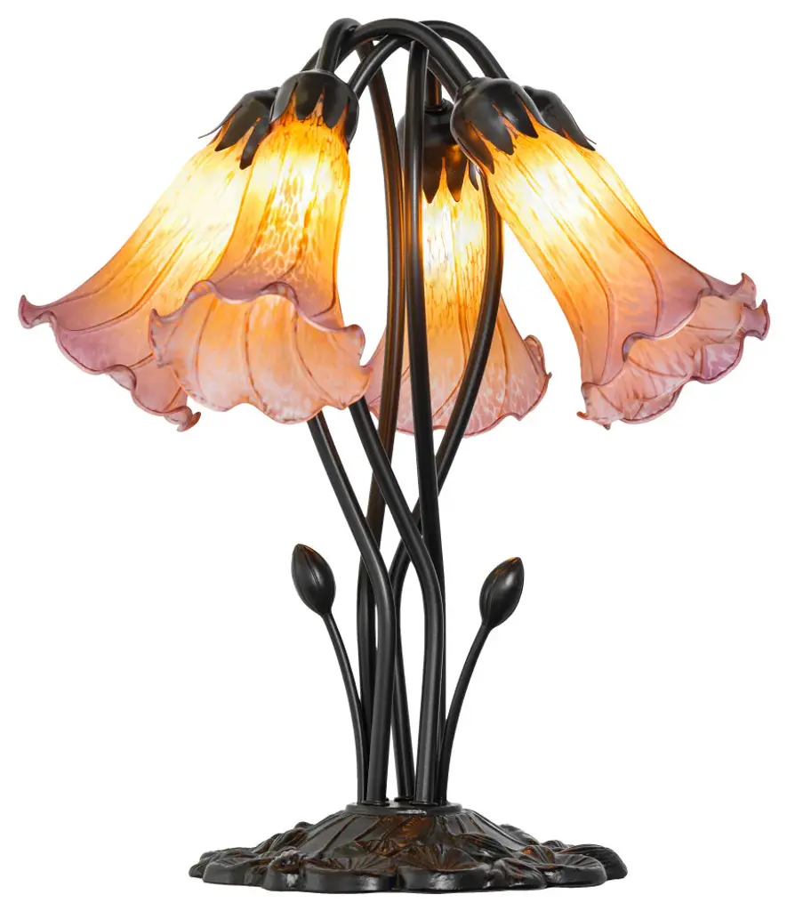 Recreating the popular Tiffany design from the early 1900s... This table lamp offers an attractive; delicate design featuring three stunning Pink art glass shades. The Pond Lily shades are embraced by an elegant cast metal base that is finished by hand in Mahogany Bronze. The Pond Lily Mini Lamp is featured in our American designed; handcrafted Tiffany Reproduction Favrile Glass Lighting Collection. Each shade is a unique work of art with color variations based on natural ingredients inherent in the glass. Contact us if color matching is critical when ordering multiple items.