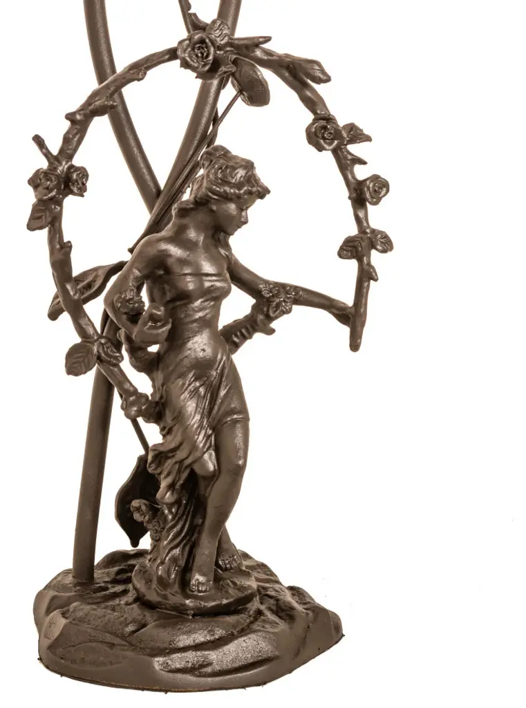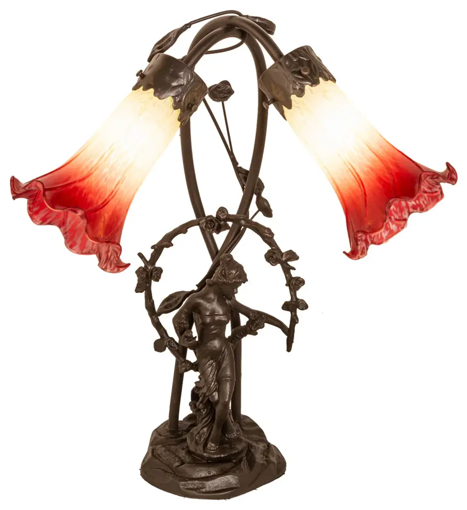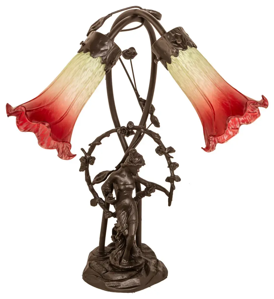 Inspired by the famous Tiffany design from the early 1900s. This table lamp features two stunning shades mouth blown of fine Seafoam and Cranberry glass. The Pond Lily shades are embraced by an elegant cast Trellis Girl base finished by hand in Mahogany Bronze. The Pond Lily Table Lamp is featured in our American designed; handcrafted Favrile Glass Collection. UL and cUL listed for dry locations. Each shade is a unique work of art with color variations based on natural ingredients inherent in the glass. Contact us if color matching is critical when ordering multiple items.